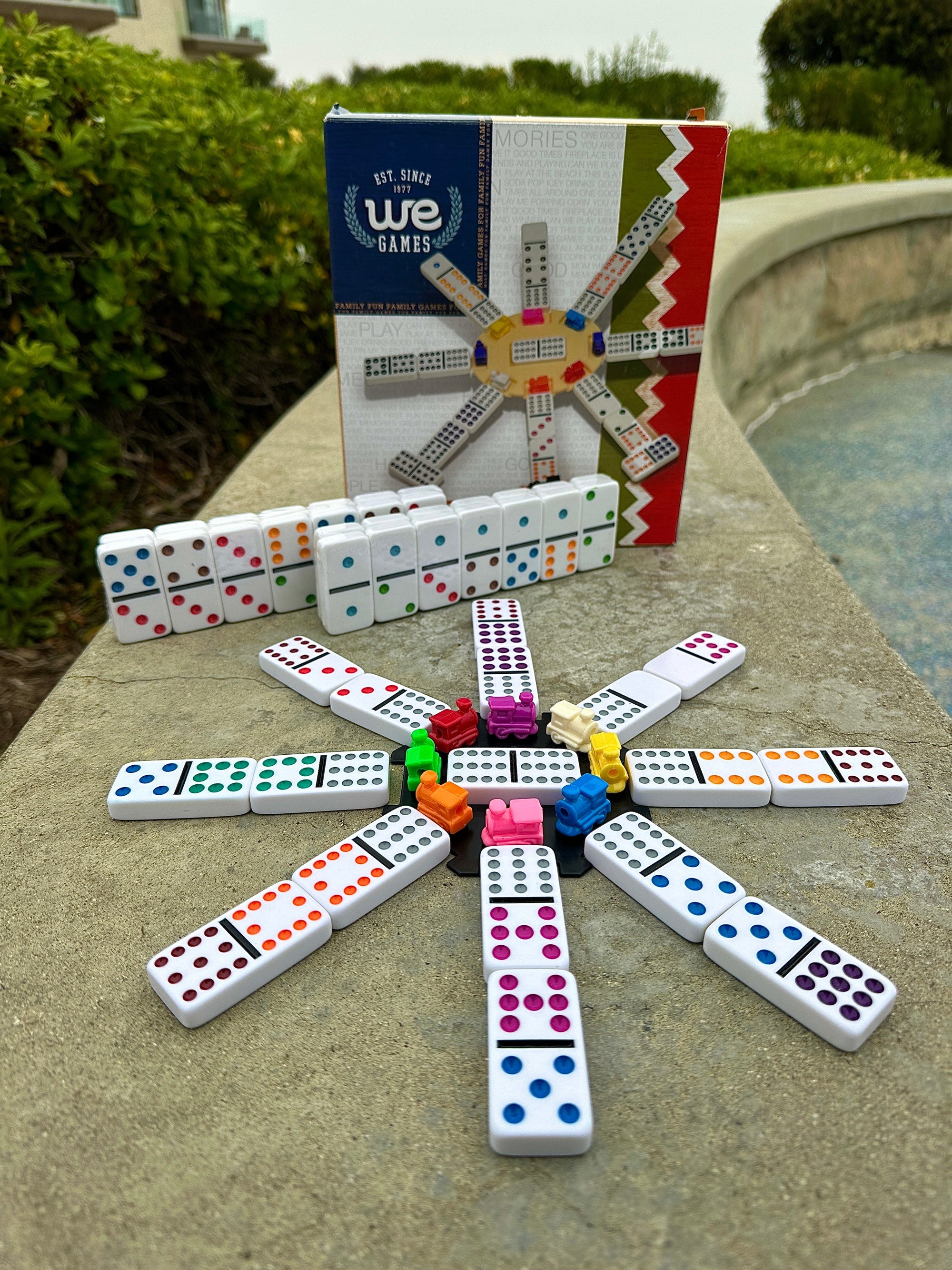 WE Games Mexican Train Dominoes with Wooden Treasure Box - White Tiles with Colored Pips - Thick Size