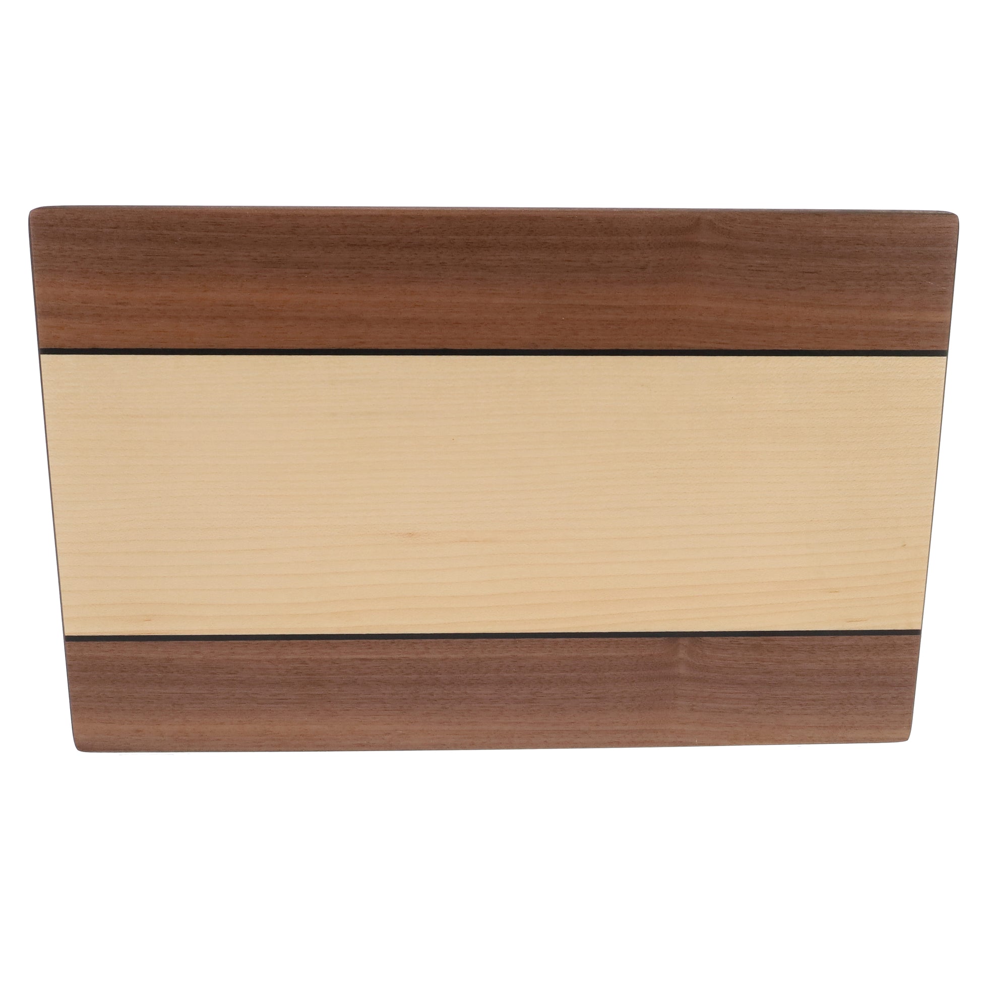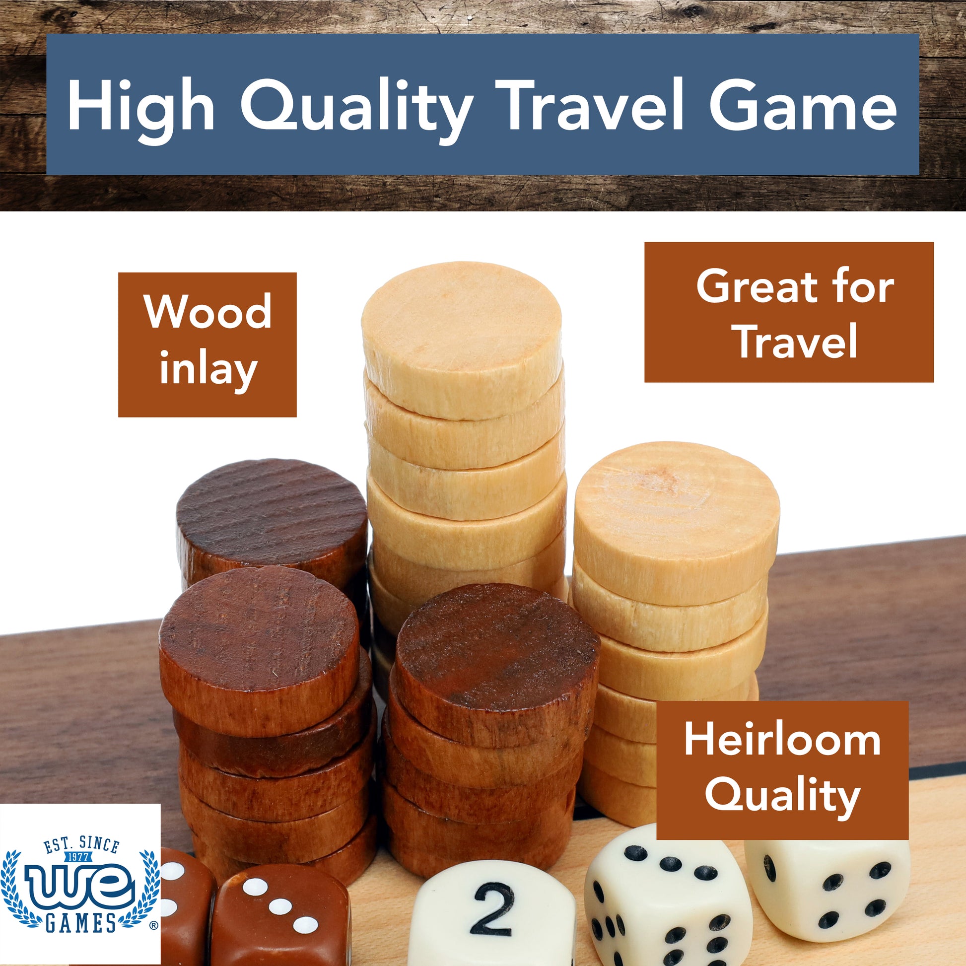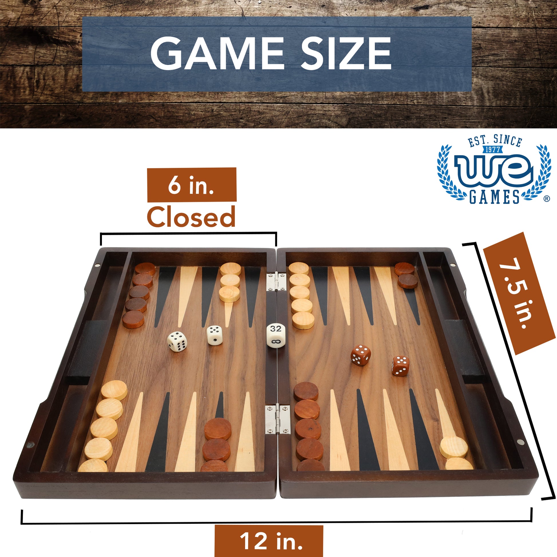 This handsome wood backgammon set looks sleek with a dark Walnut wood stain. The modern design features recessed handles and magnetic closures in the corners of the board and piano style hinges. The playing field features seamless wood inlay points. The size is larger than a typical travel set, but not too large for a table-top playing surface. Makes a beautiful gift.