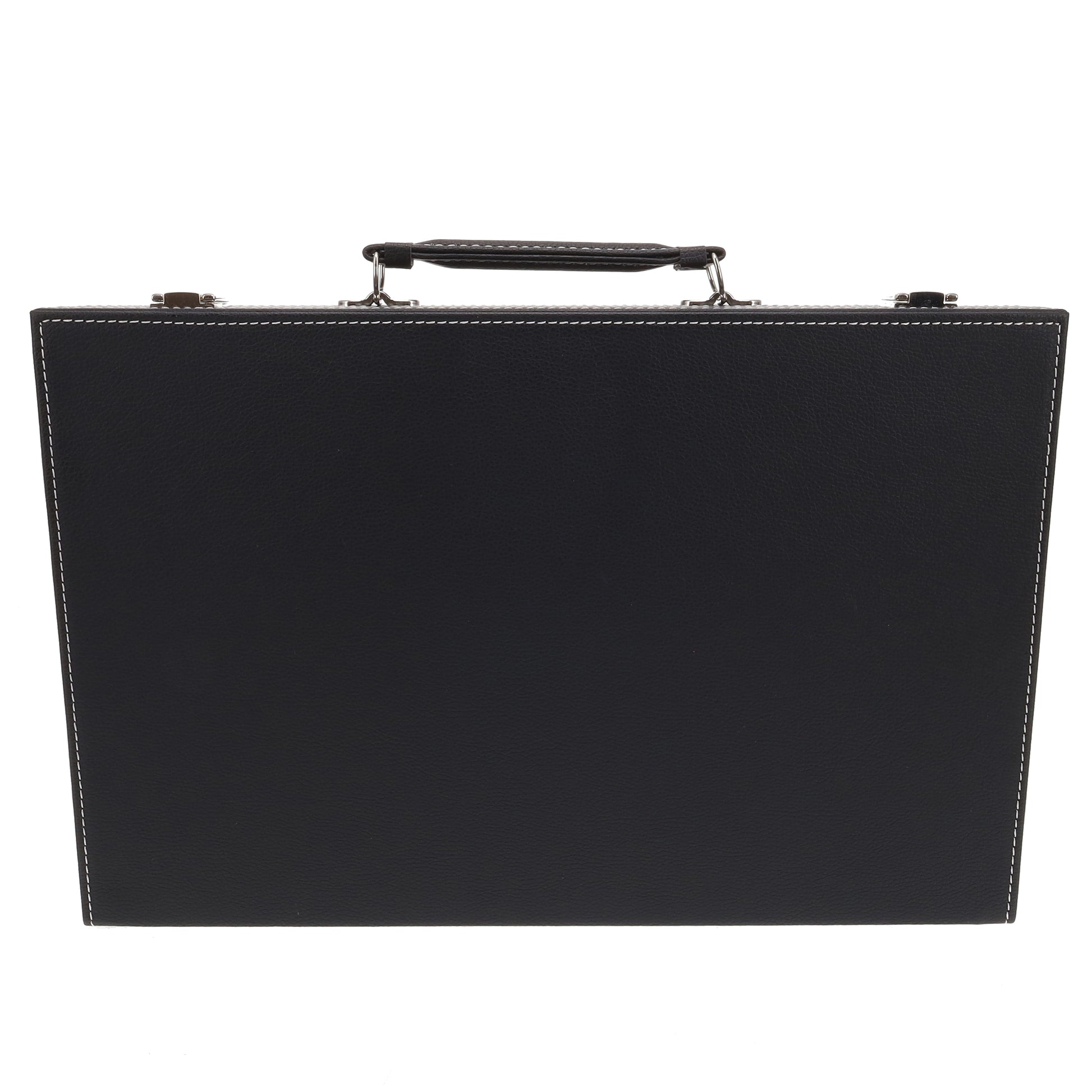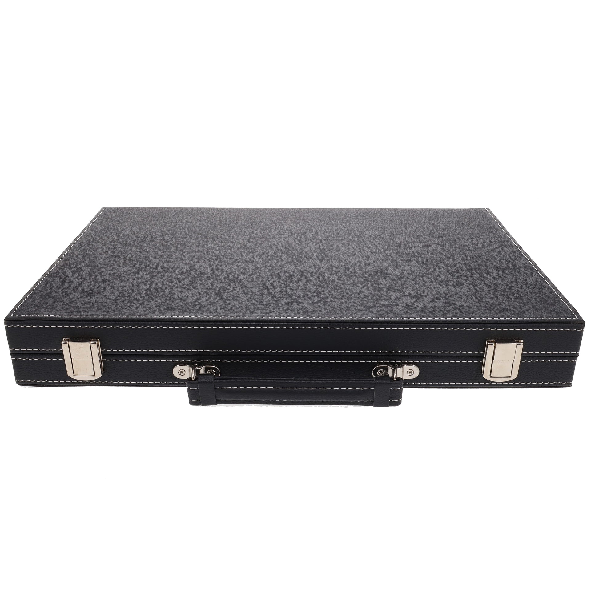 A handsome 15 inch backgammon set in a in a stylish black leatherette case with white stitching and horse shoe latches that contains everything you need for a challenging game of backgammon. The sturdy and intricate construction of this set is what sets it apart from others. The playing field is a soft velvety fabric with leatherette points sewn onto the surface. The set includes 30 backgammon chips in two different colors, 2 felt lined dice cups, 4 dice in two different colors, and 1 doubling cube. The dice cups are leatherette and are felt-lined to keep the dice rolling noise to a minimum. All the games pieces fit nicely within the game case for easy storage when traveling. This is a handsome addition to your game collection. It is up to you to bring the strategy!