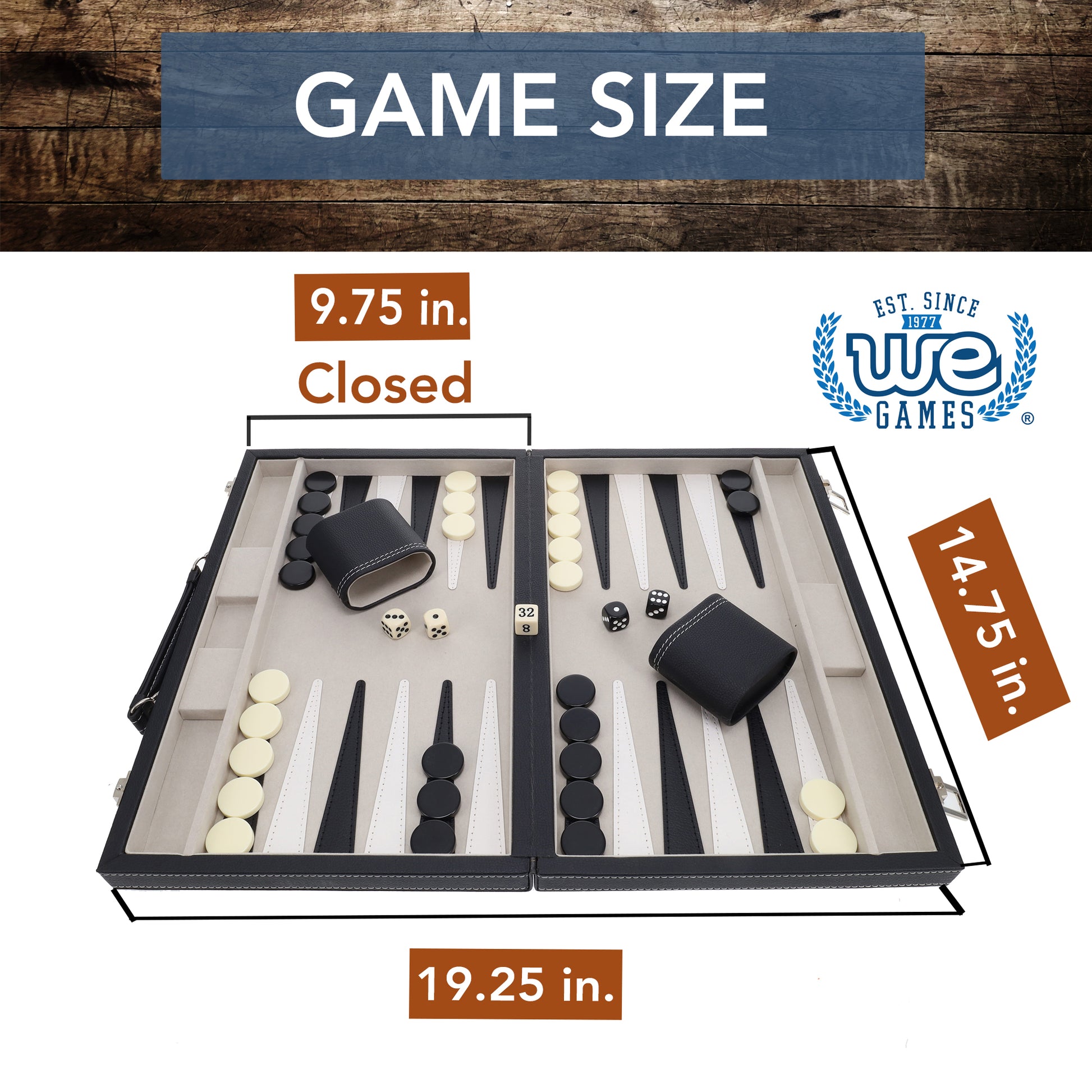 - TRAVEL GAMES: Travel backgammon sets for adults, classic briefcase style, full-size backgammon board with metal clasp closure and handle for travel. Board game storage for backgammon pieces and cups.