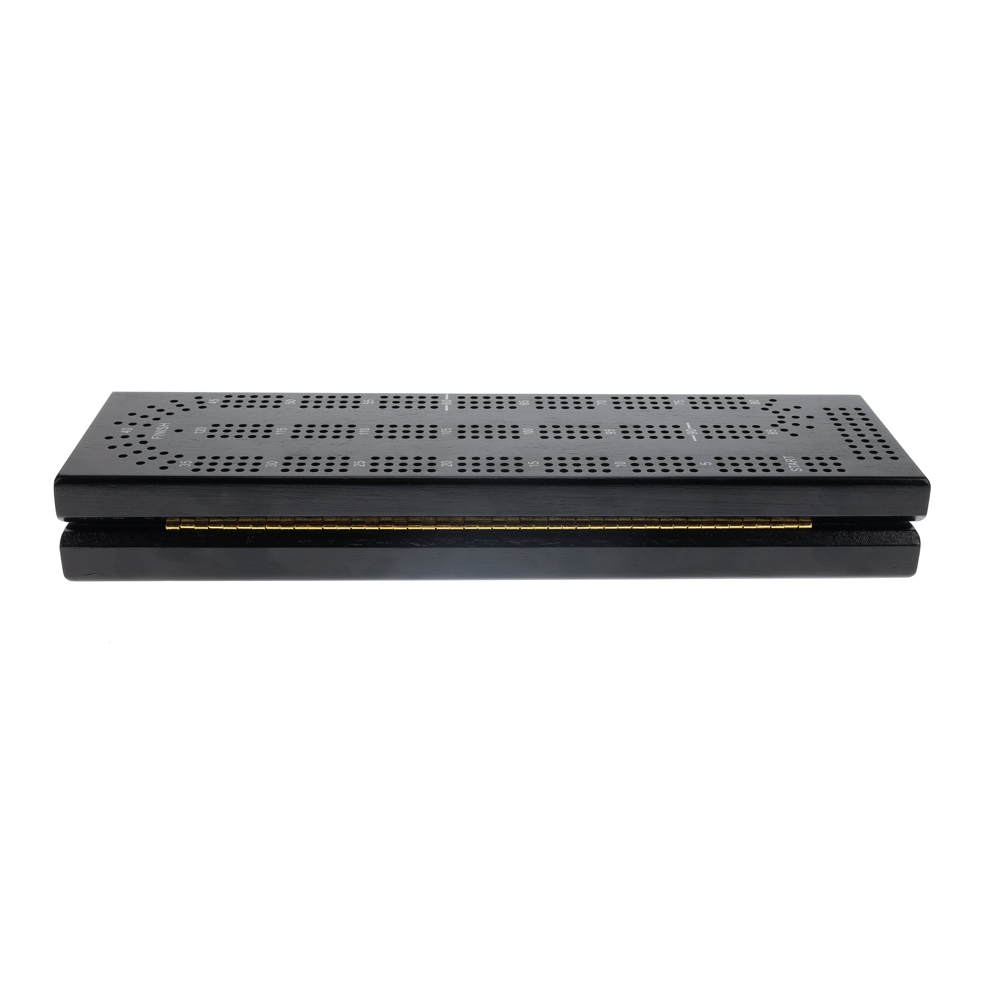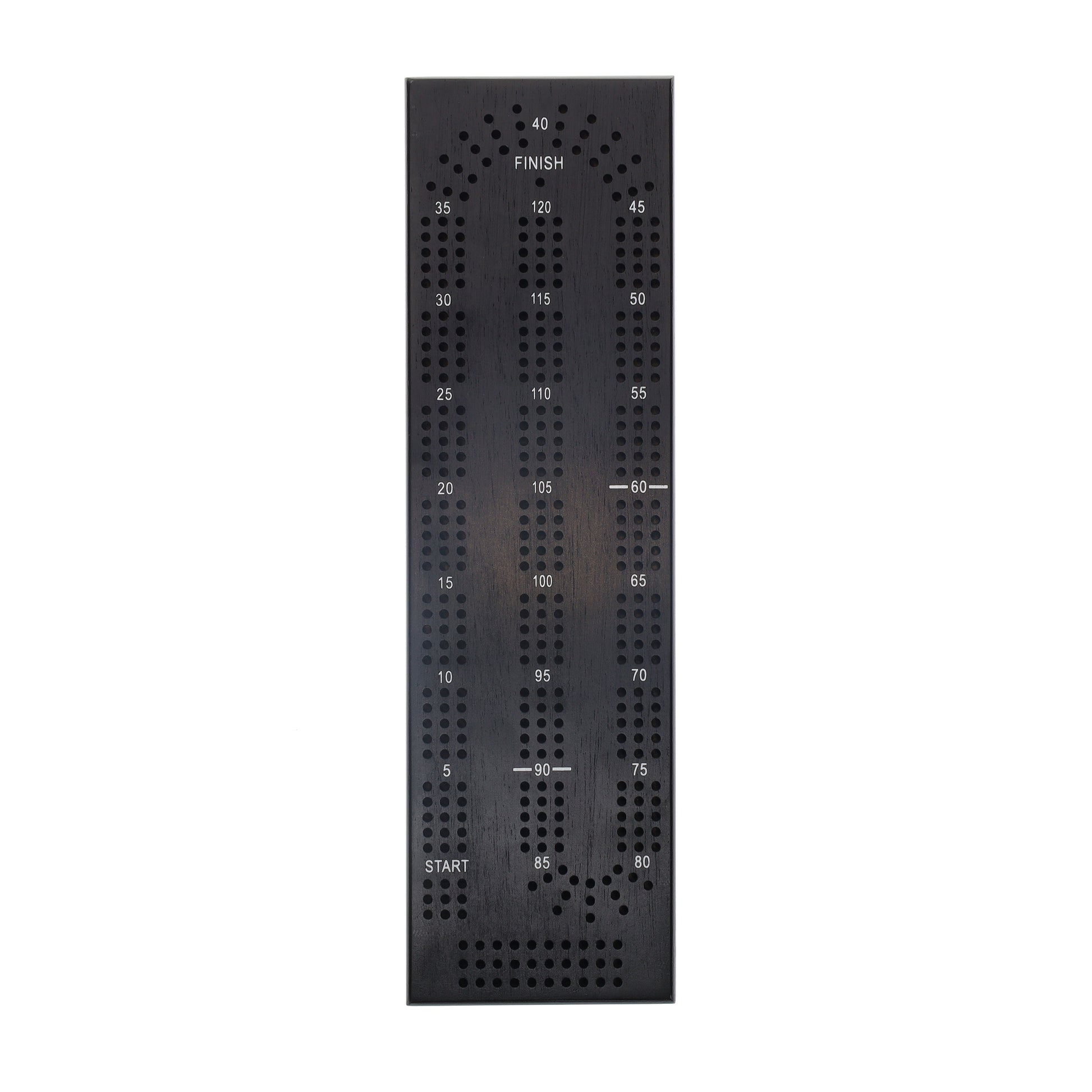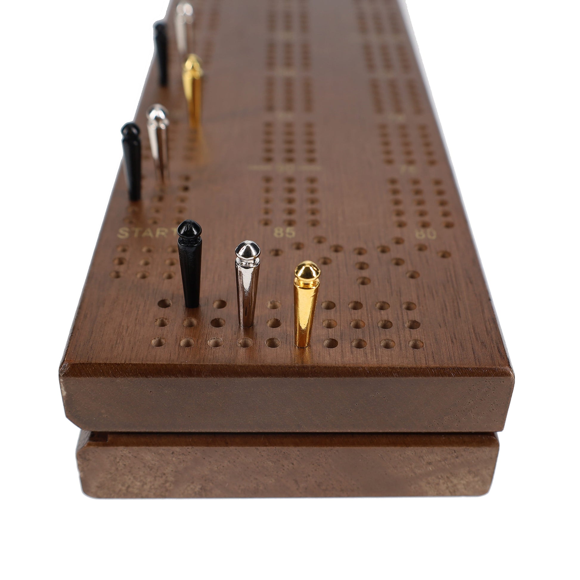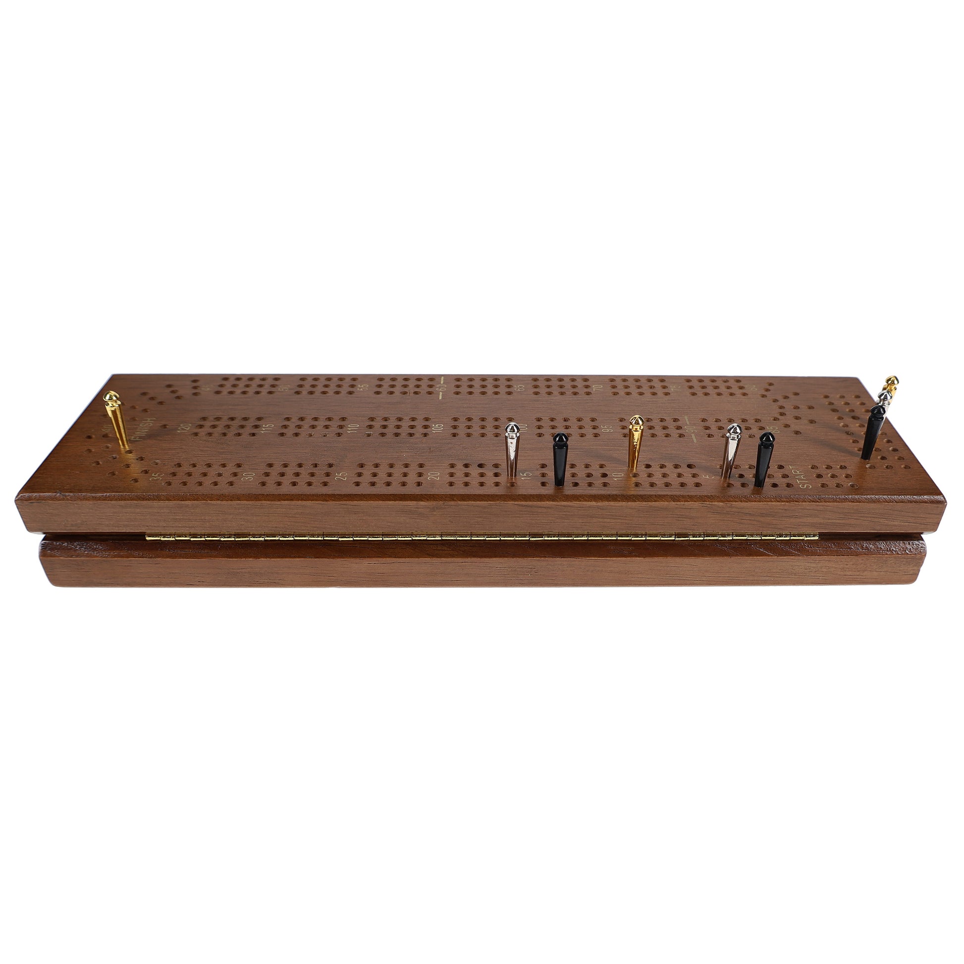 This beautiful three-track cabinet cribbage board is crafted from eco-friendly and sustainable solid Malaysian Oak hardwood with a satin finish applied. The solid-wood board has a piano styled hinge for strength and a magnetic closure to keep the 9 metal easy-grip pegs and deck of cards stored neatly inside. Velveteen felt lines the storage compartments within the board. The continuous three track scoring surface has a 90 point skunk line and numerical notations printed in black. The peg holes are precision drilled. Includes 3 peg starting area, 120 count full-sized board, skunk lines, a peg out finish hole and game wins tracking. It is the perfect gift for Father's Day, graduation, housewarming, or for the newly weds that love the game of cribbage. This gift will be cherished for generations. Dimensions are 12.0"L x 3.5"W x 1.5"H.