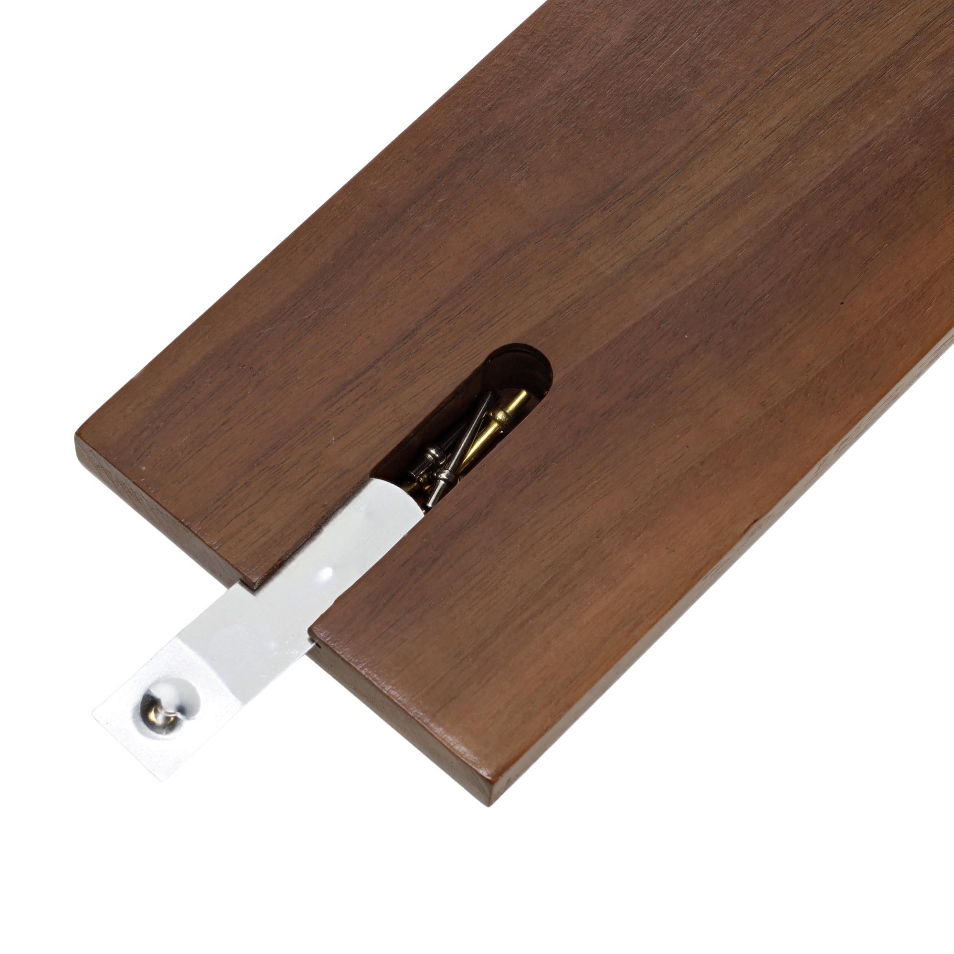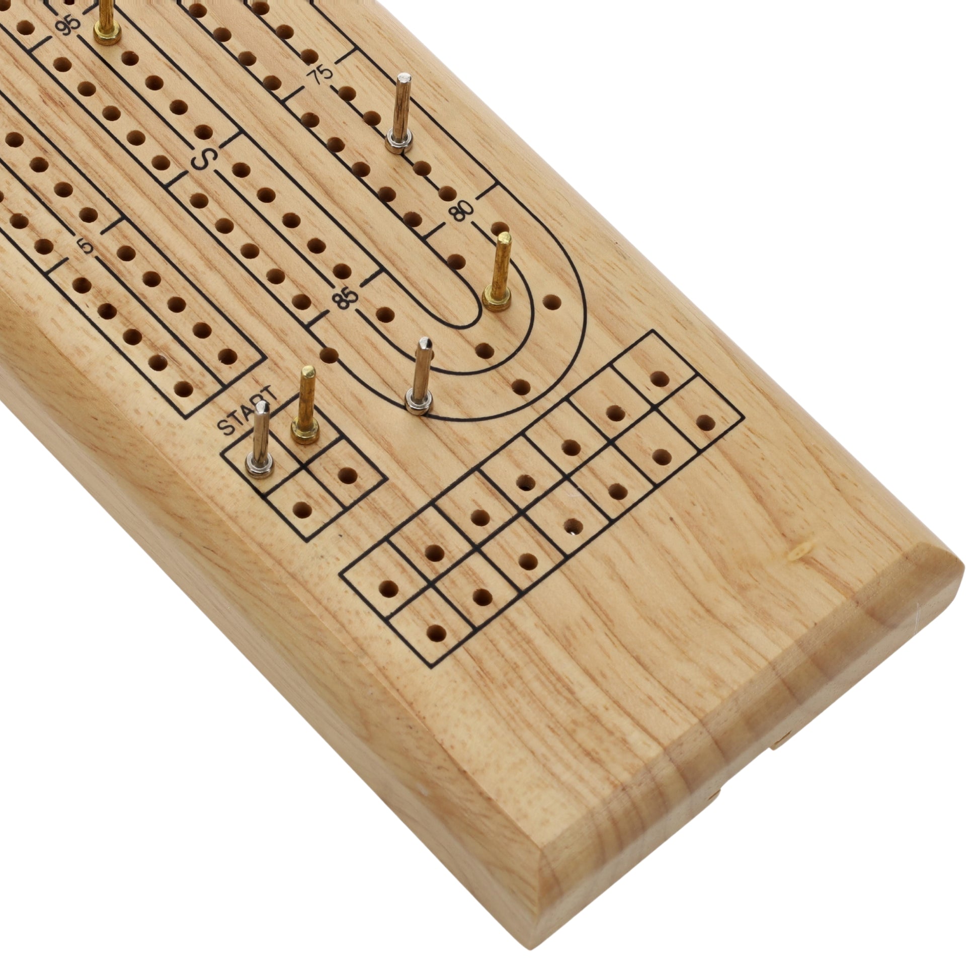 This beautiful two-track cribbage board is handsomely crafted from eco-friendly and sustainable solid hardwood with a satin finish applied. It features a continuous two track scoring surface with a 90 point skunk line and numerical notations printed in black. The peg holes are precision drilled. Includes 2 peg starting area, 120 count full-sized board, skunk lines, a peg out finish hole and game wins tracking. Sliding metal door beneath board hides storage compartment for pegs.