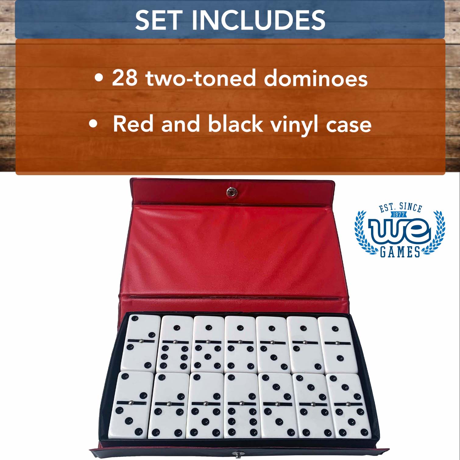 Dominoes is a tile game that can be played just about anywhere with a flat surface. Play it on the floor, at the park, or on the kitchen table. While it is enjoyed in many countries and cultures around the world, it is most popular in Cuba, Puerto Rico, and other Latin countries of the Caribbean. Play dominoes in style with this classic set of premium double-six dominoes. Enjoy the clicking sound of the tiles with their smooth surface and clean, black pips. Transport them in the nostalgic black and red vinyl case with snap closure. A great addition for any vacation home, game room, or man cave, this is a gift that will be enjoyed for years to come.