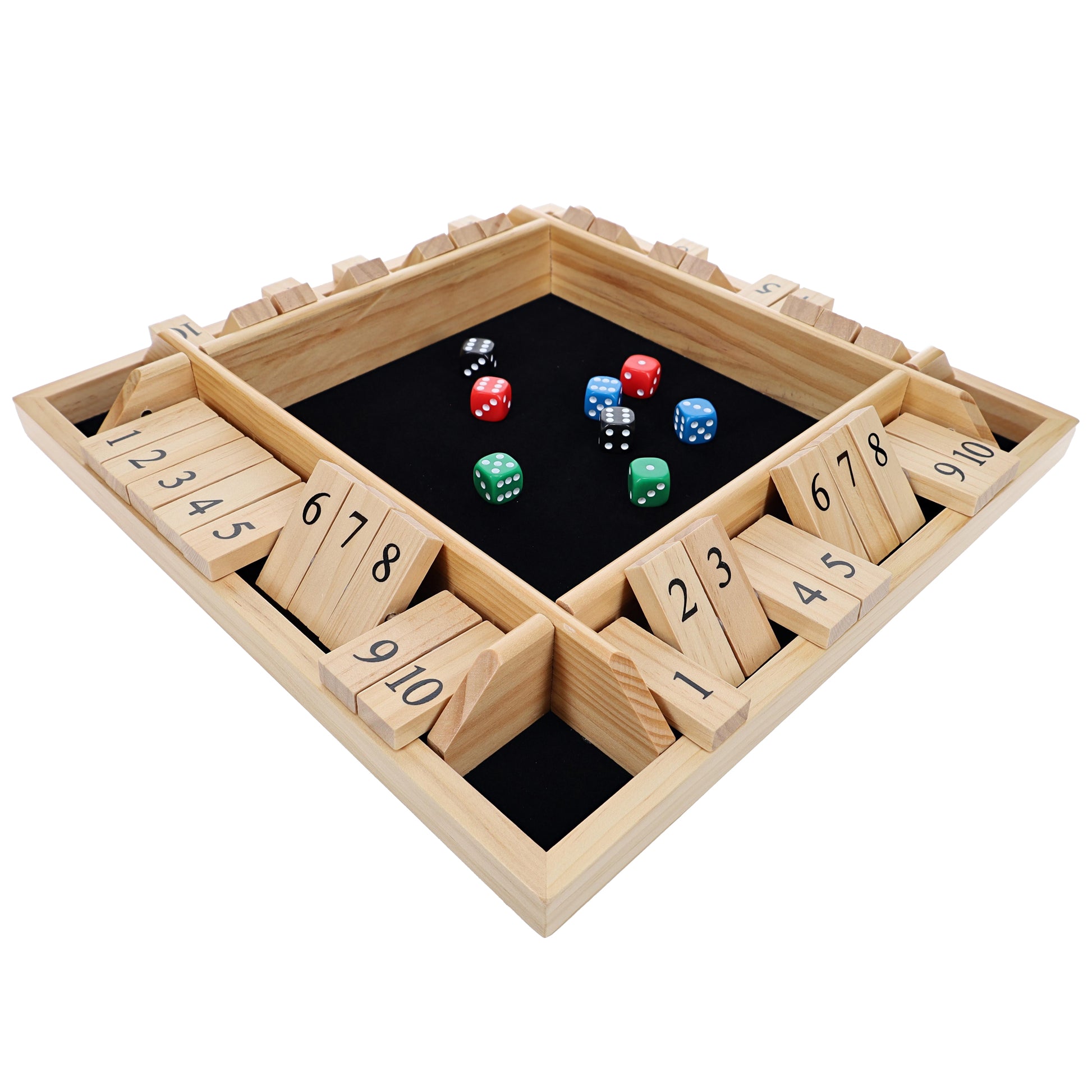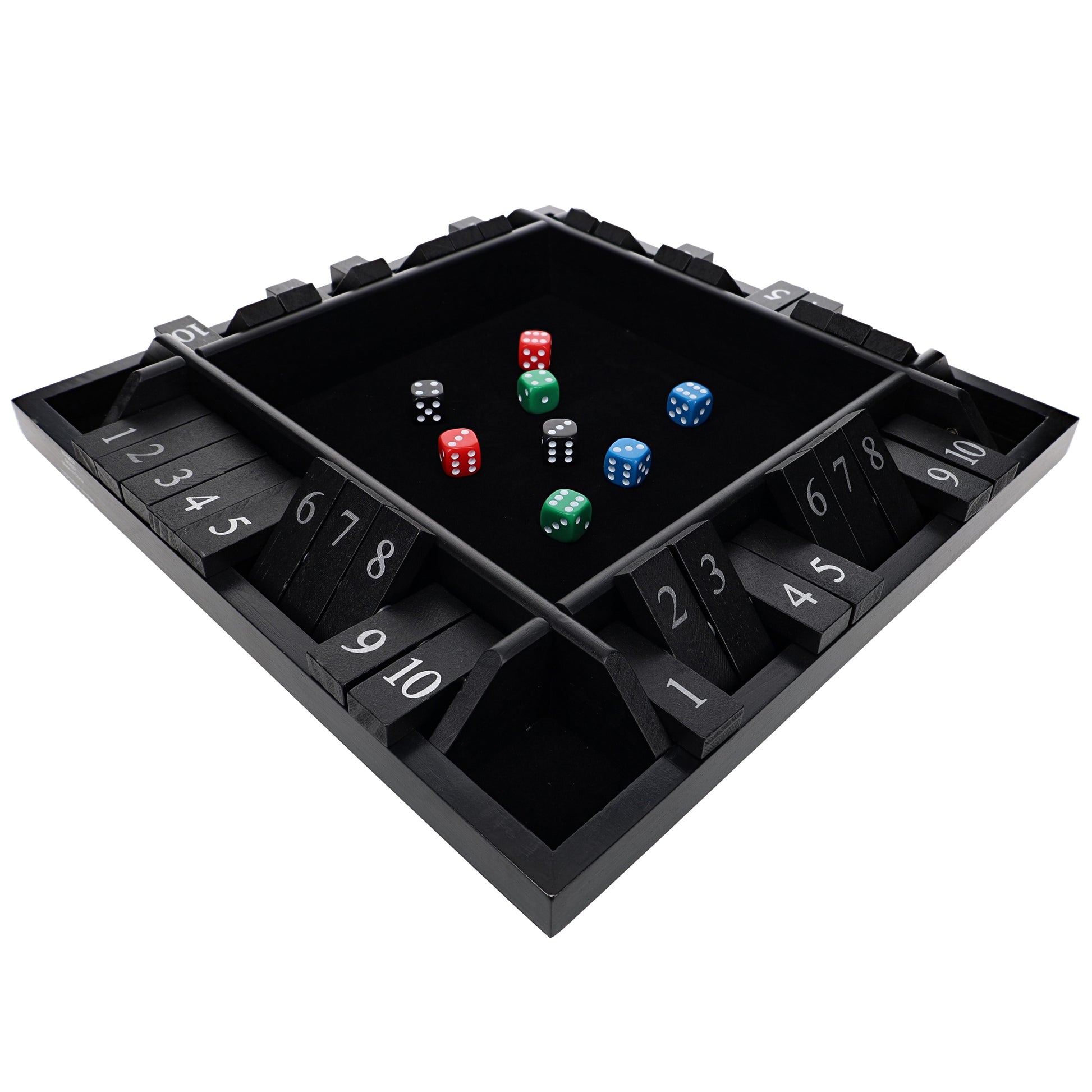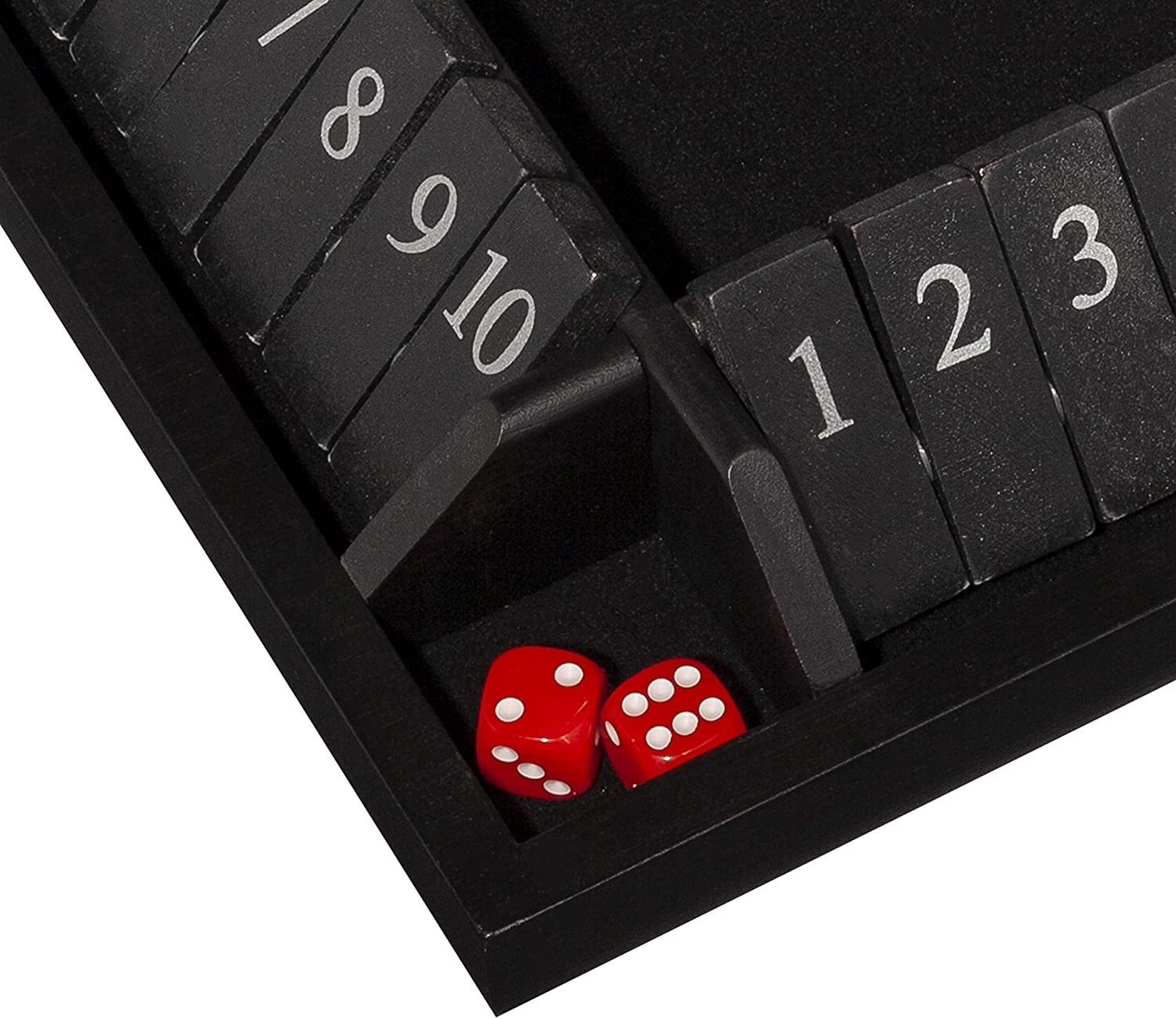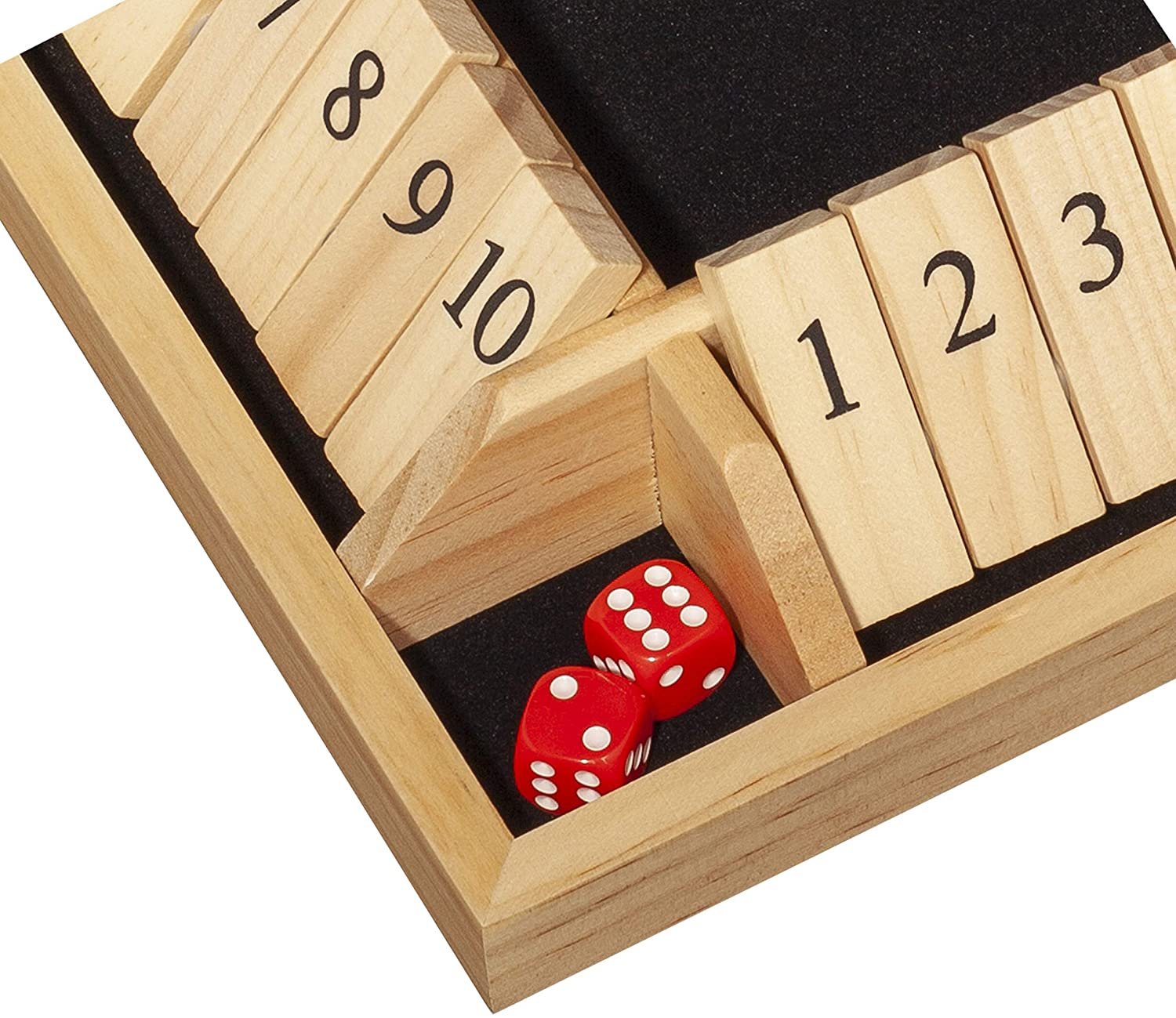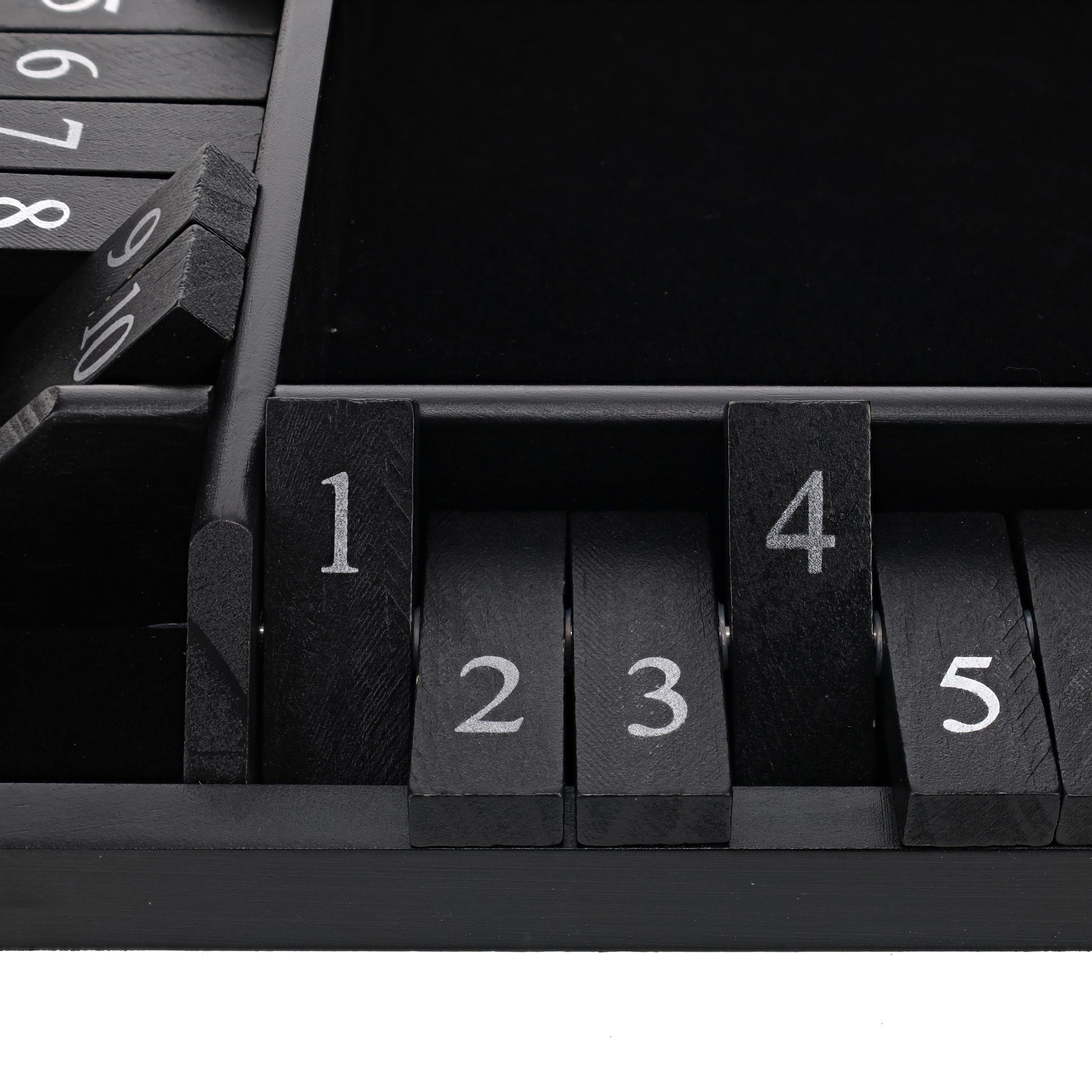 This beautiful game is crafted from solid hardwood and features 10 wooden number tiles bringing more numerical combinations into play. Can be played with any number of players. Includes eight dice (4-different colors) so each player gets their own dice color. This makes it easier for all players to be rolling at once if you prefer to play the race version of the game. The playing surface is lined with black velveteen felt for the softest of dice rolls. Also features velveteen felt on the underside of the game to prevent scratches to table top surfaces. Originally, the game was played by fishermen off the coast of Normandy more than two hundred years ago. After a long day at sea, they would squander away their earnings by playing this dice game. It is no wonder it is still enjoyed in pubs across North America and Europe. While we don't advocate gambling, we do advocate this beautiful, well-constructed game that will provide hours of fun wherever you go. This game also teaches and reinforces addition skills as players roll the dice, add up the values, and then lay down the tiles that have the sum. These simple rules keep the player engaged in computing addition facts while enjoying socializing with friends. Teachers use this game in classrooms and the game's sturdy construction will make it outlast other versions.