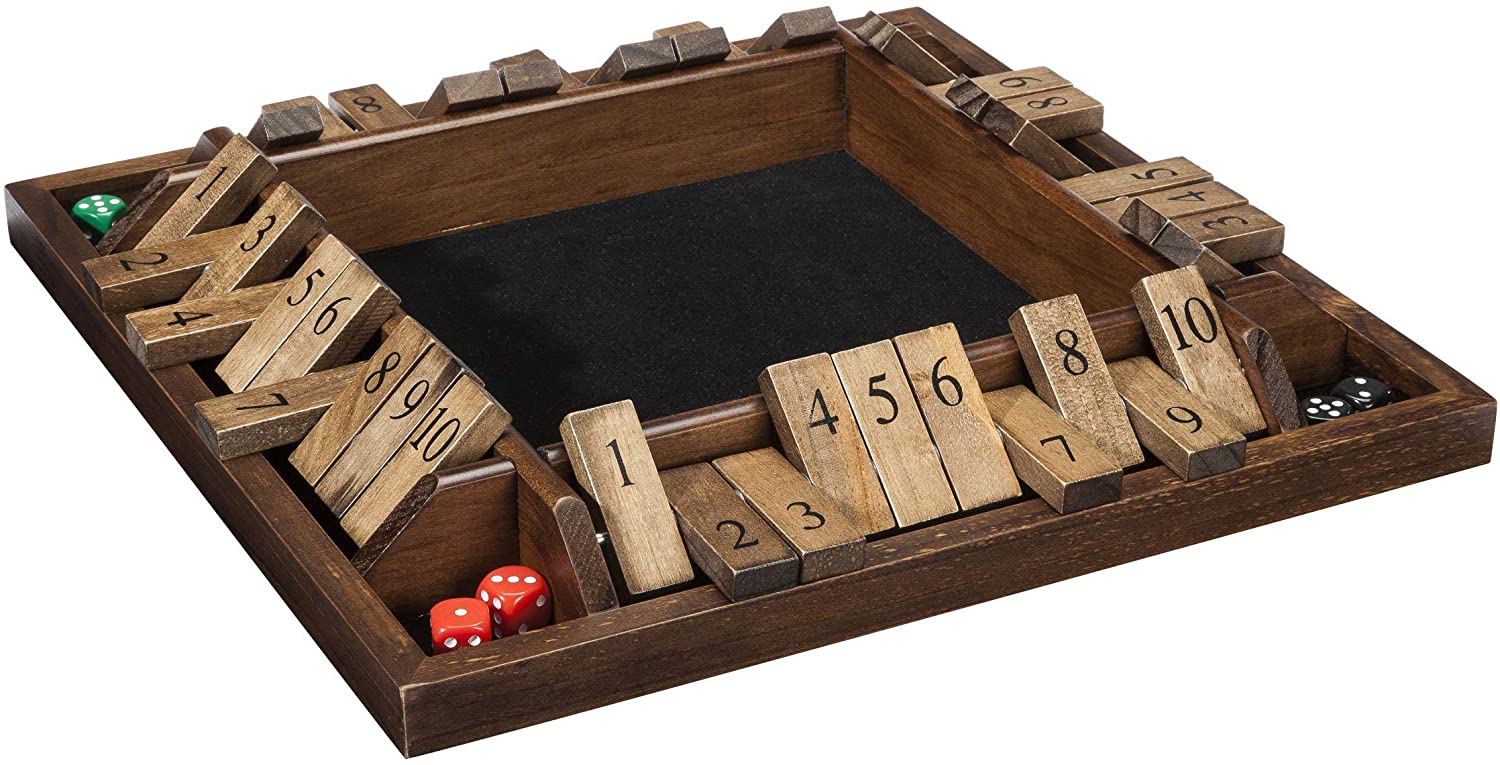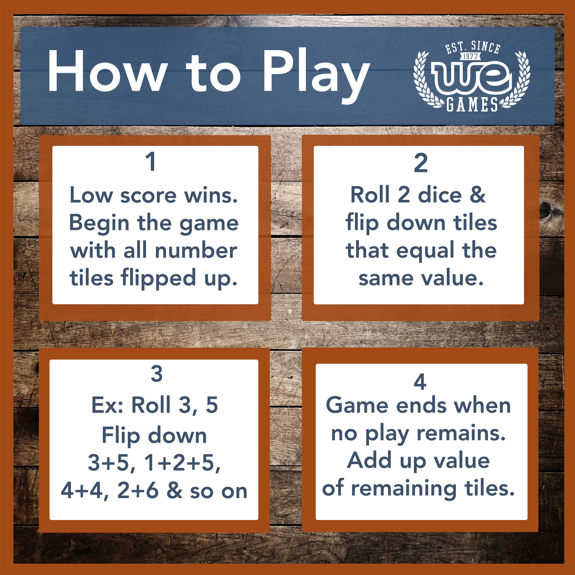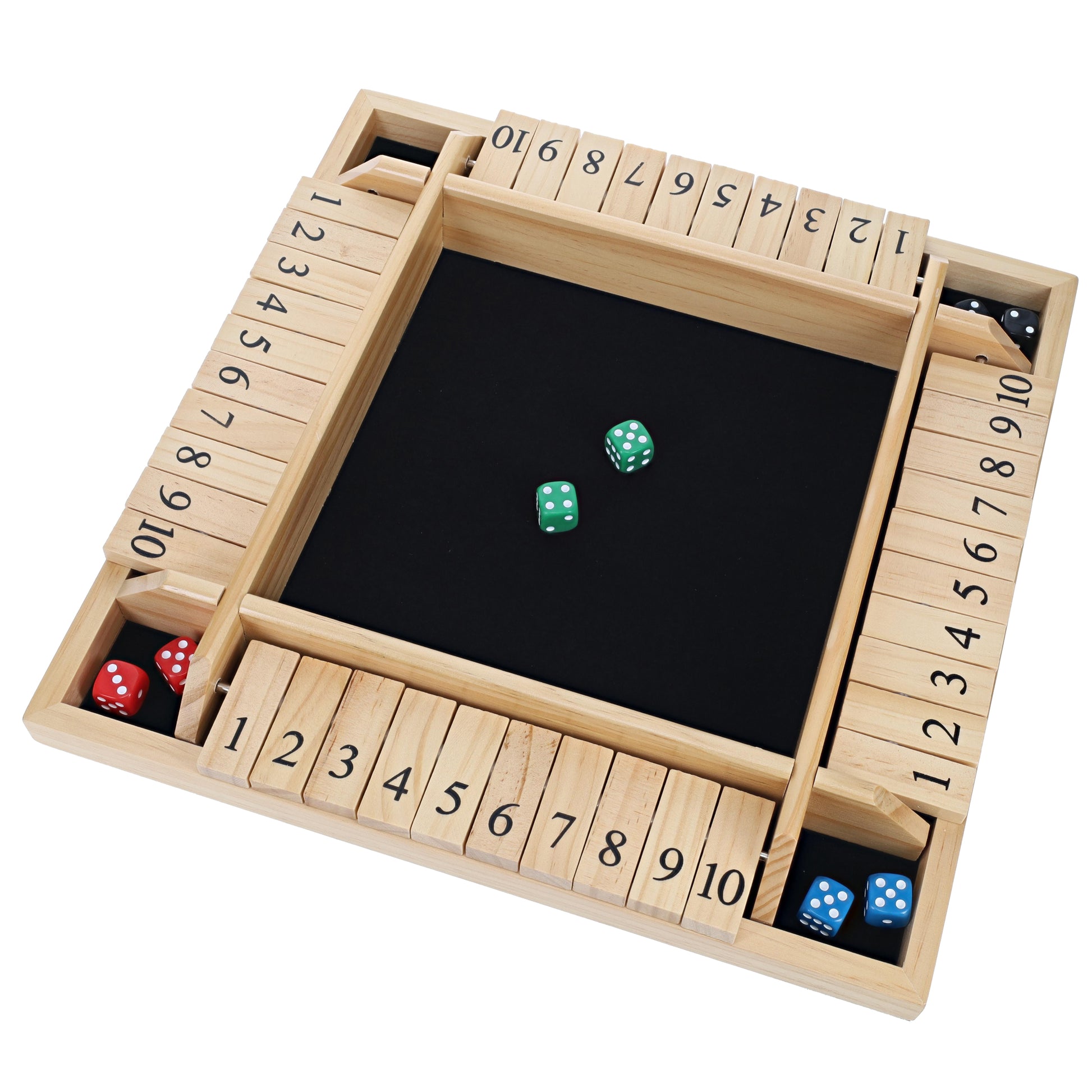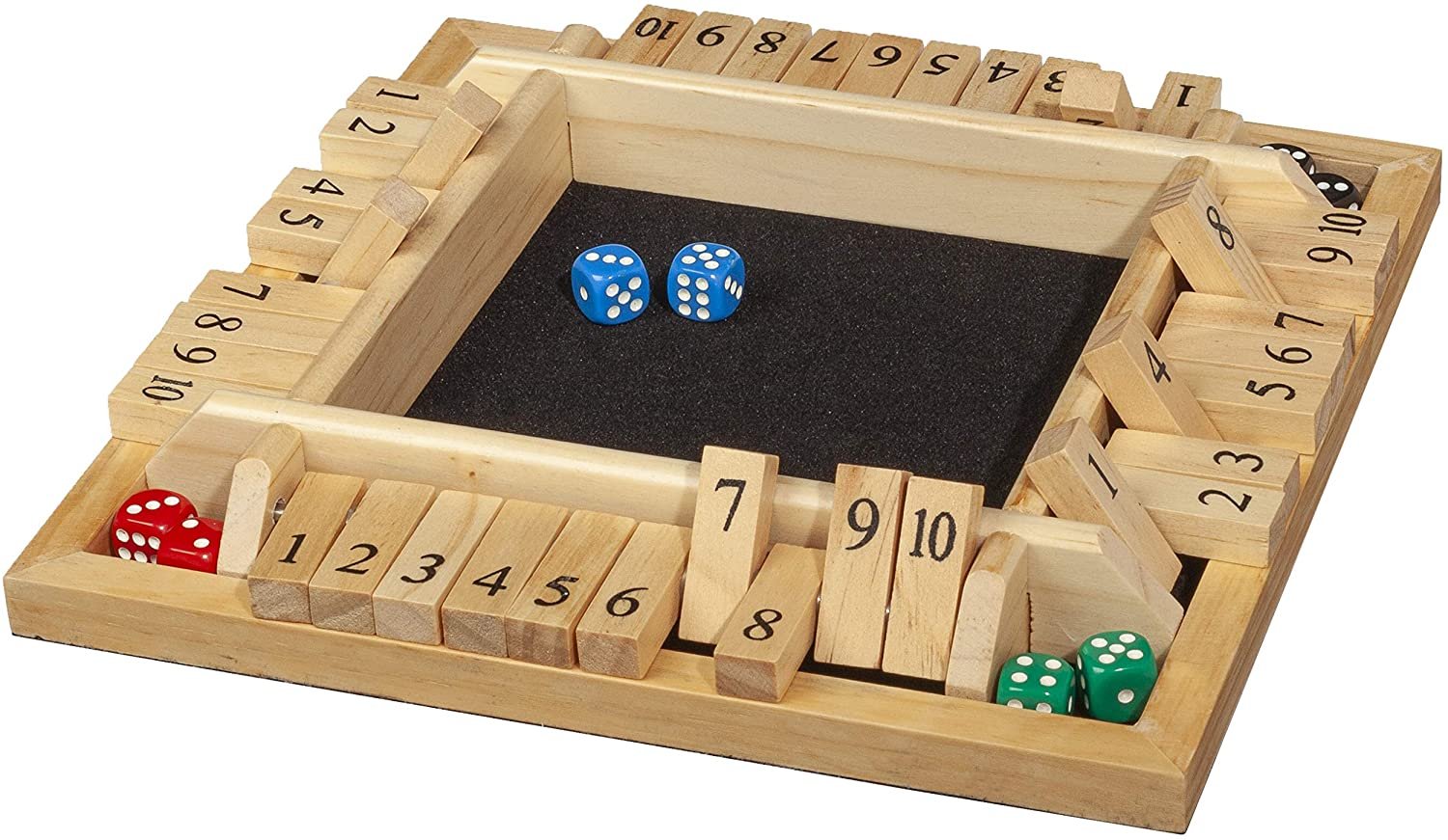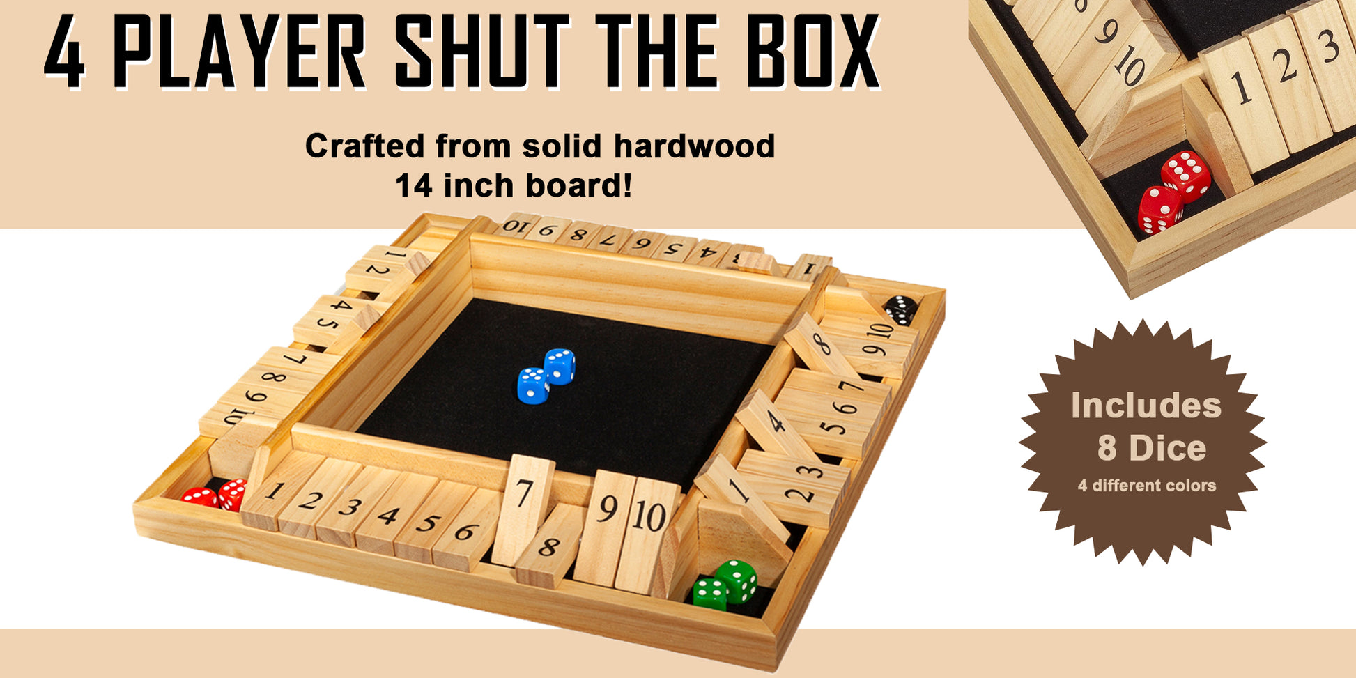 This beautiful game is crafted from solid hardwood and features 10 wooden number tiles bringing more numerical combinations into play. Can be played with any number of players. Includes eight dice (4-different colors) so each player gets their own dice color. This makes it easier for all players to be rolling at once if you prefer to play the race version of the game. The playing surface is lined with black velveteen felt for the softest of dice rolls. Also features velveteen felt on the underside of the game to prevent scratches to table top surfaces. Originally, the game was played by fishermen off the coast of Normandy more than two hundred years ago. After a long day at sea, they would squander away their earnings by playing this dice game. It is no wonder it is still enjoyed in pubs across North America and Europe. While we don't advocate gambling, we do advocate this beautiful, well-constructed game that will provide hours of fun wherever you go. This game also teaches and reinforces addition skills as players roll the dice, add up the values, and then lay down the tiles that have the sum. These simple rules keep the player engaged in computing addition facts while enjoying socializing with friends. Teachers use this game in classrooms and the game's sturdy construction will make it outlast other versions.