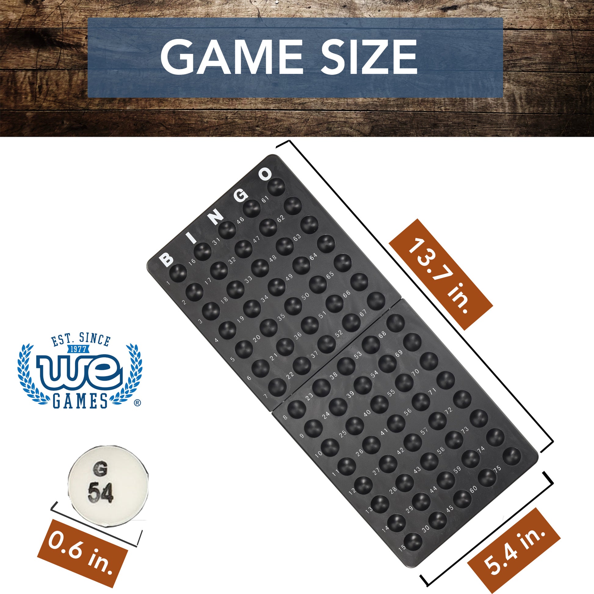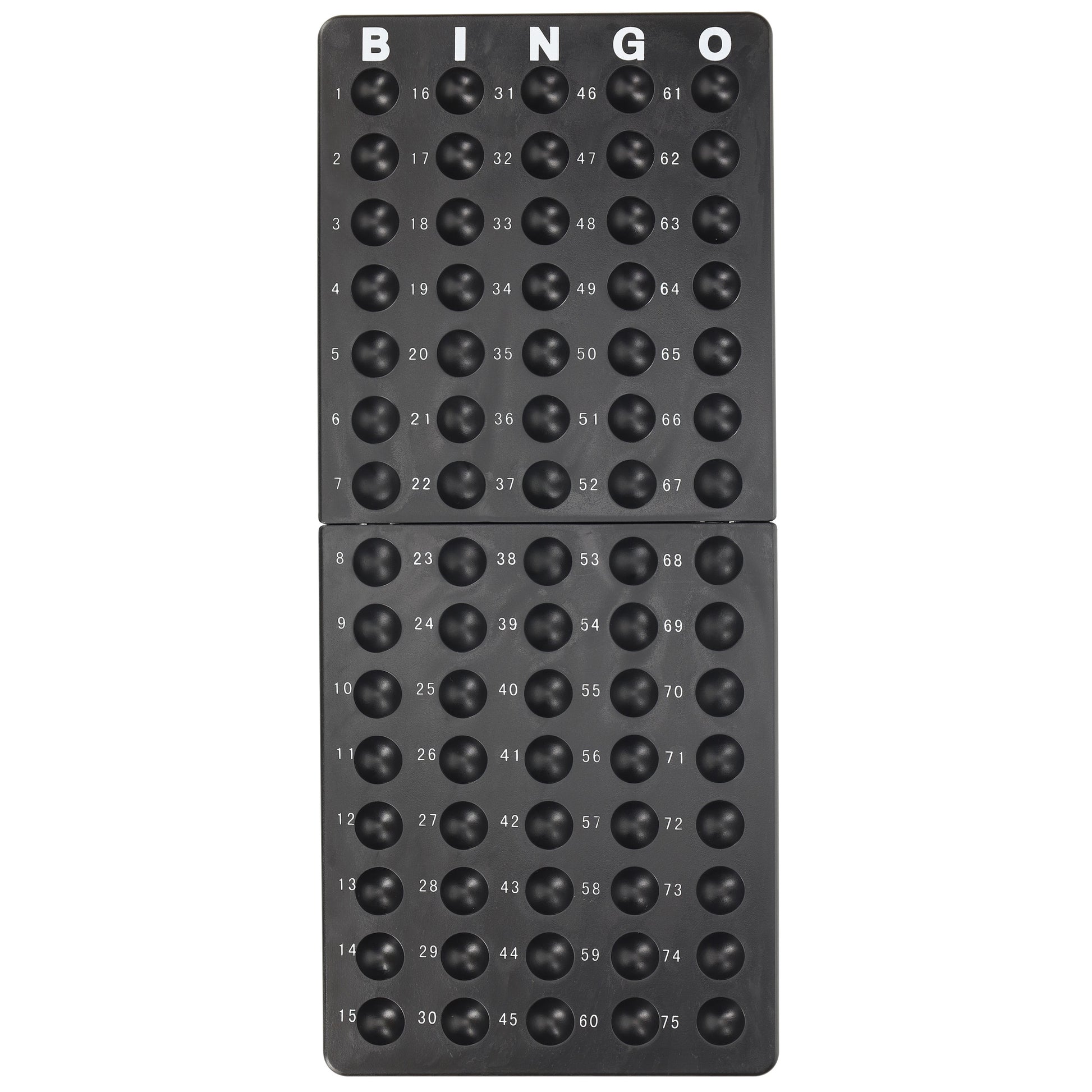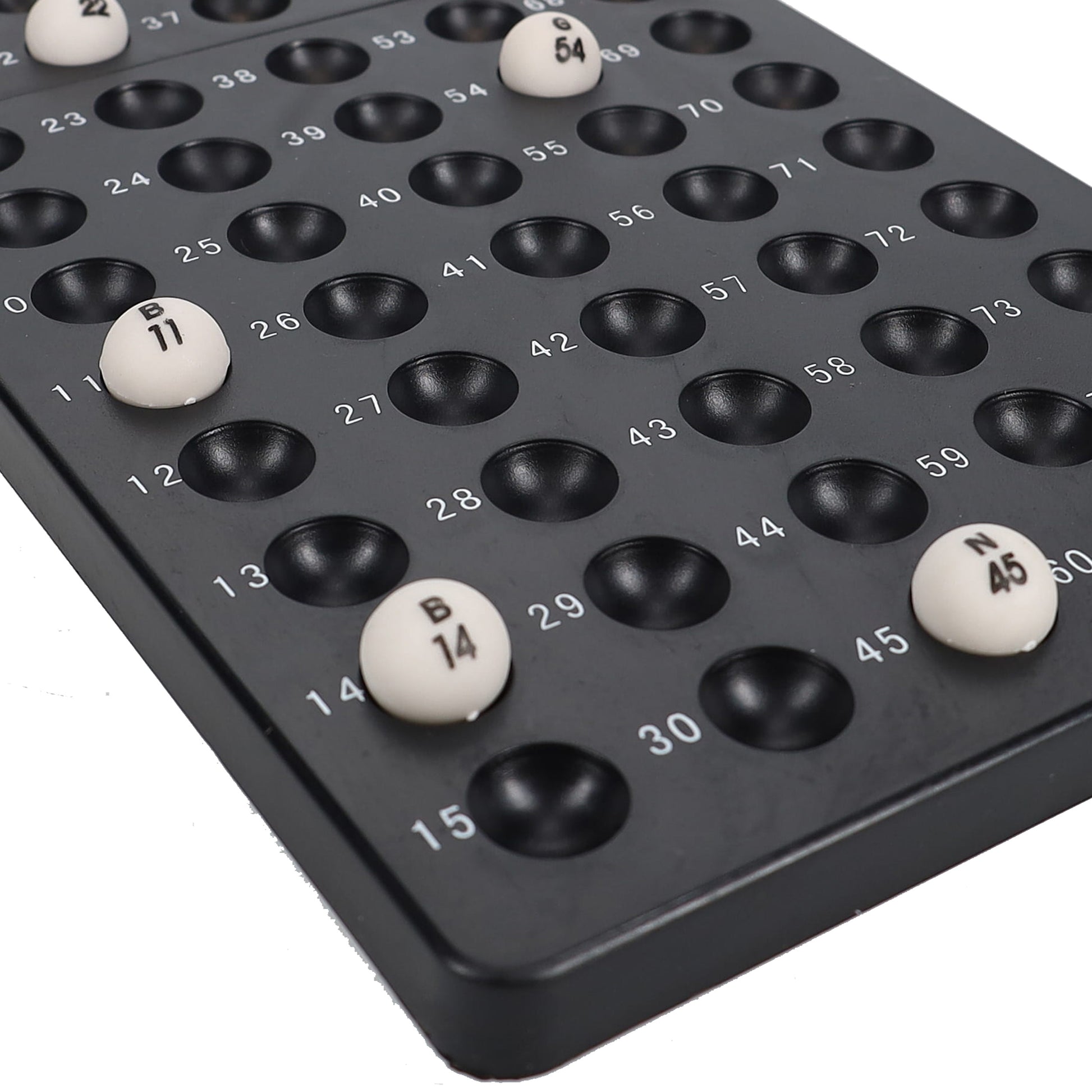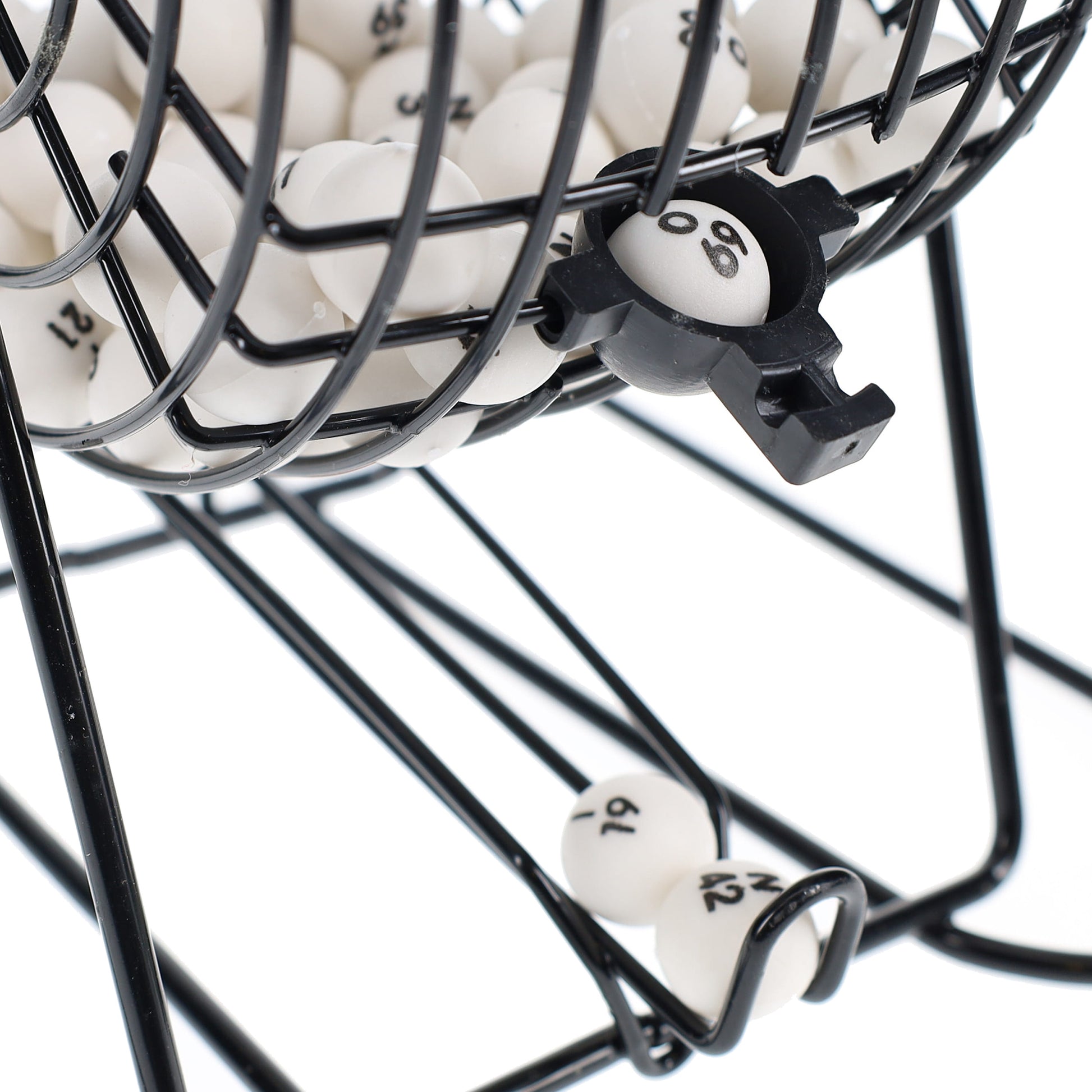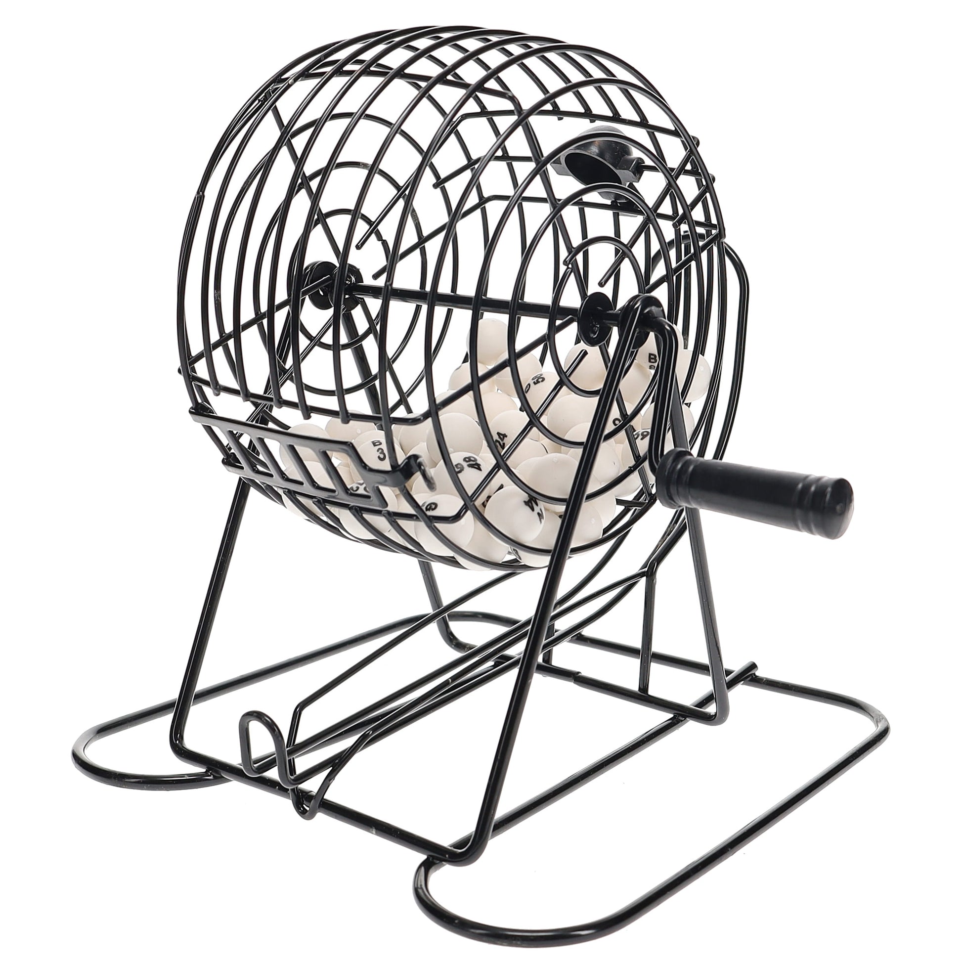 - BINGO SUPPLIES: Retro black Bingo cage (5.75 x 13.26 in.), 75 Bingo balls (.6 inch), plastic folding master board (14.25 x 6 in.), 18 reusable Bingo sheets (4.38 x 4.78 in.) and colorful bingo chips.