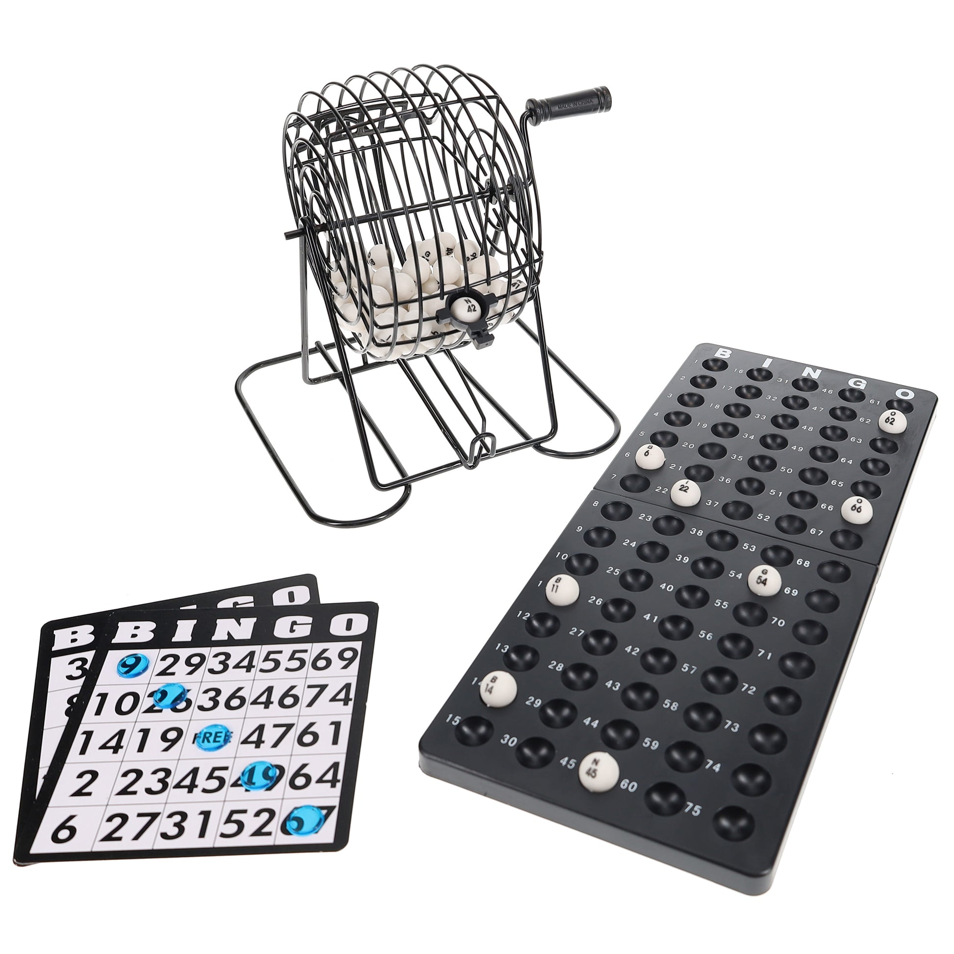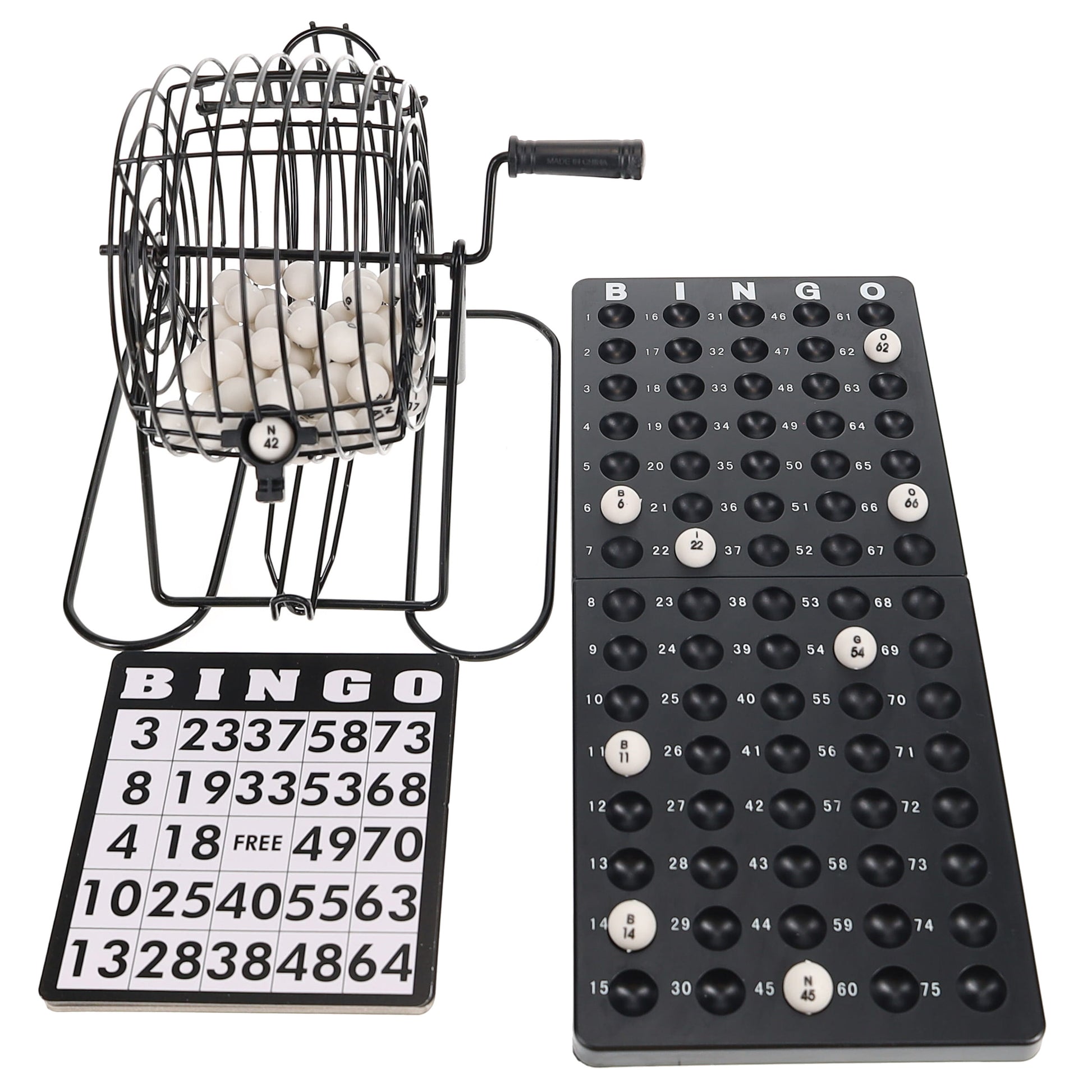 - COMPLETE BINGO GAME FOR ADULTS: Includes black plastic master board, retro bingo cage or raffle drum, 75 plastic numbered bingo balls, 18 reusable bingo cards, plus bingo chips for bingo games