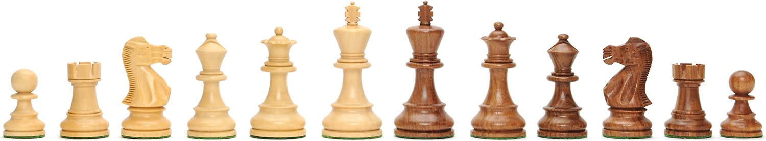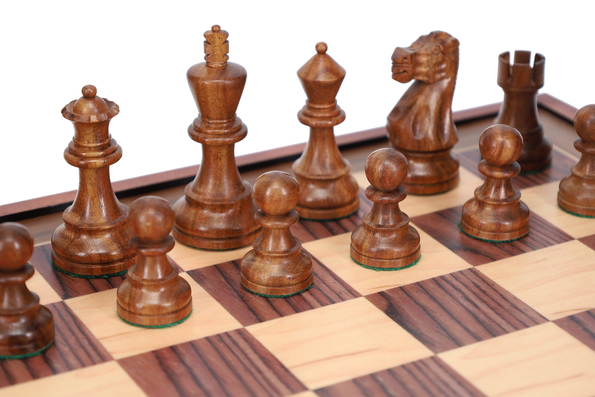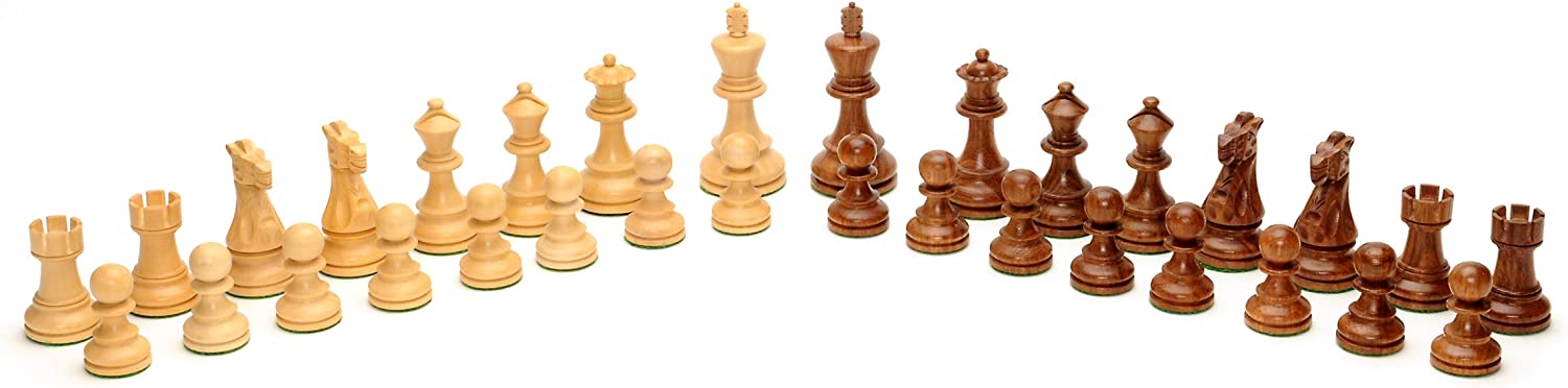 This deluxe wooden chess set with classic English style is stunning. It features a large 19 inch board with two convenient pull-out drawers for storing the pieces when not in use. The generously sized chessmen are hand-carved and are crafted from Acacia and sheesham wood. The stylish pieces are weighted, polished by hand, and feature green billiard style felt bottoms for scratch free play. The board is stained wood veneer and features pull-out drawers for storage of pieces. With a glossy finish and attention to fine details, this set will add a stylish flare to any living space or office. This is a handsome chess set to be cherished for generations.