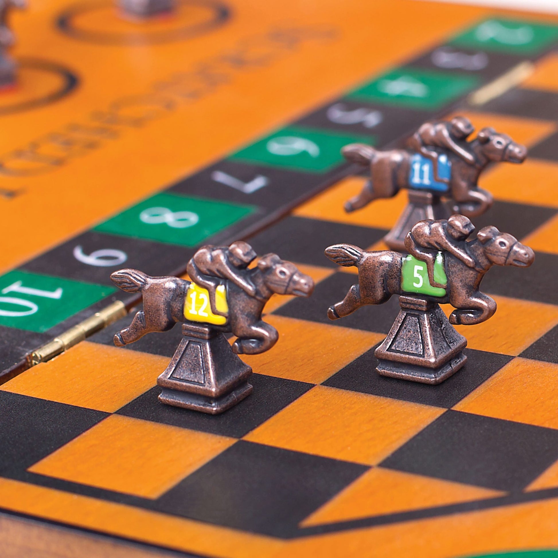 - Includes folding wood game board, cards, dice, and 4 colorful metal horses
