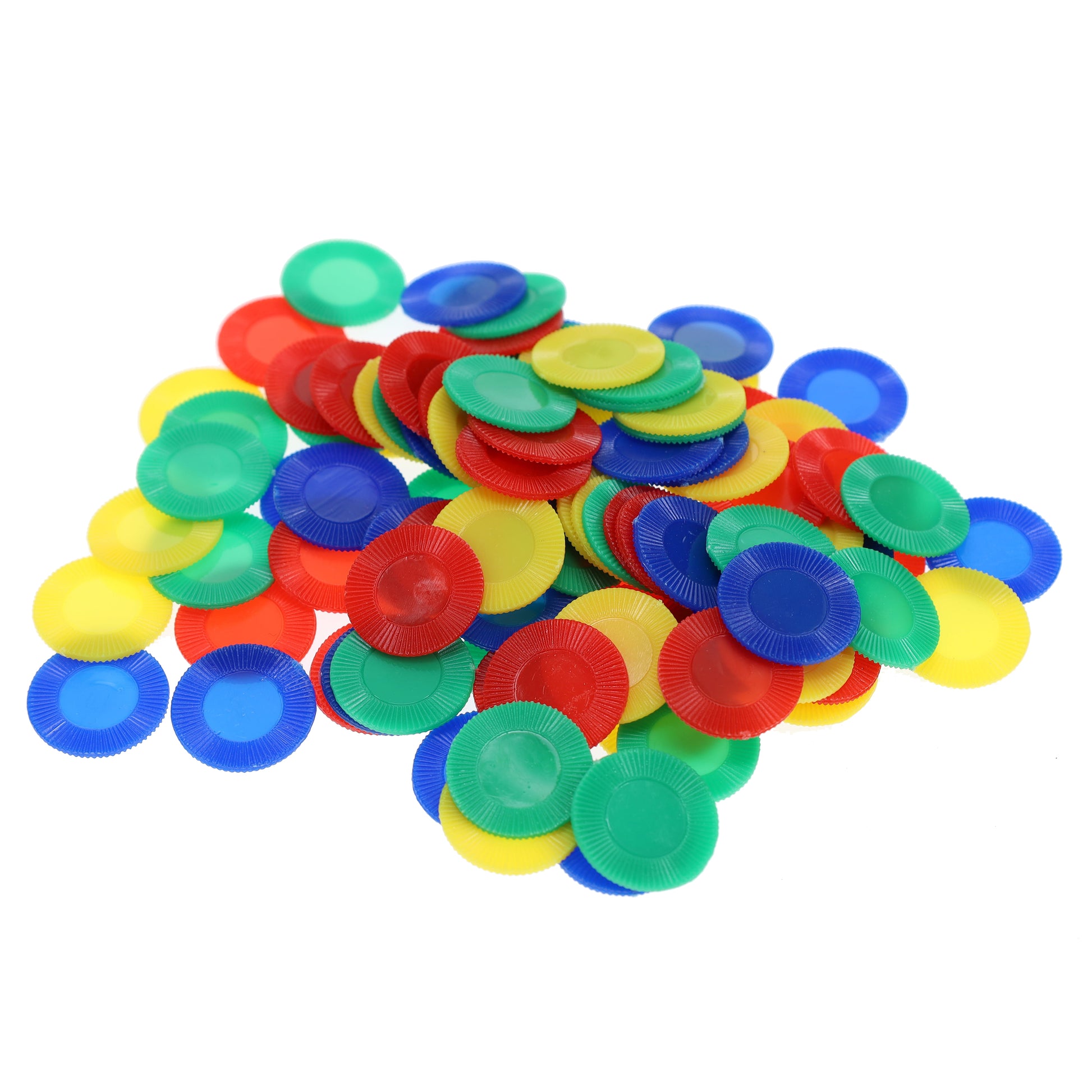 - Includes 100 chips, 25 of each color; red, blue, yellow, and green (0.85 in. diameter, 0.06 in. thick)