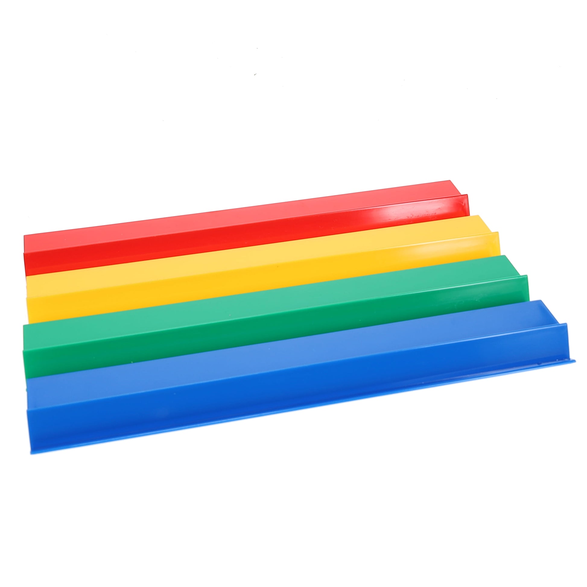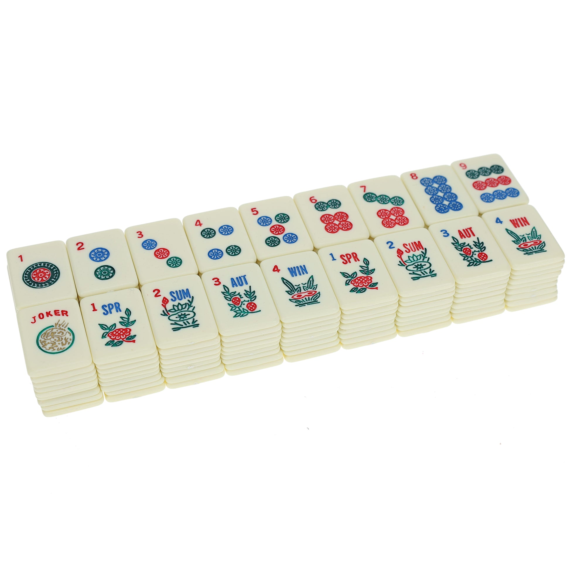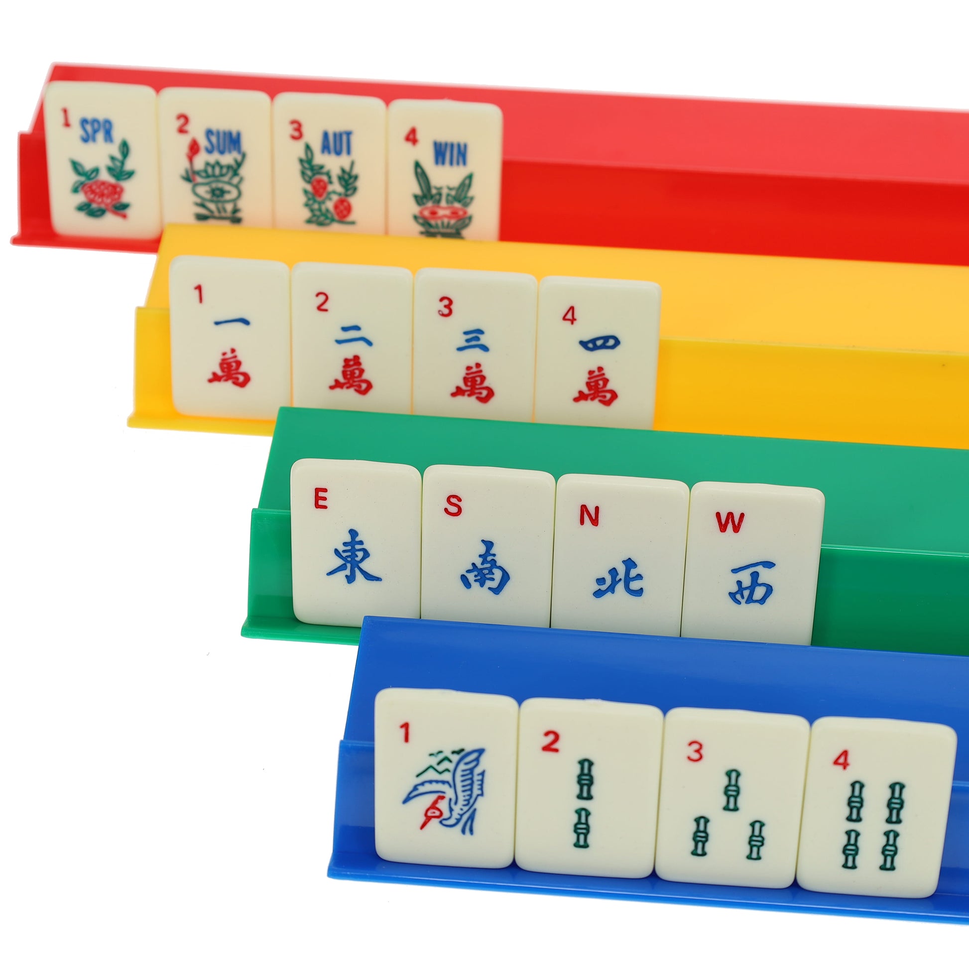 - American style Mahjong tile game, includes 4 plastic racks in different colors, red, blue, yellow and green (14 x 2.5 in)