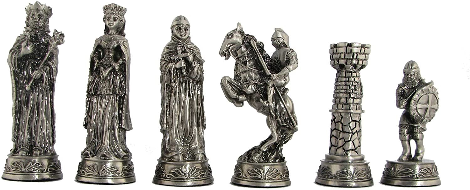 Relive the chivalry of Medieval times with this gorgeous chess set! Richard the Lionheart, the great Crusades, and the legend of Excalibur are brought to life with the finely detailed pewter chessmen. Play out the epic battles, and grandeur of the Middle Ages across your favorite board. This is a timeless set that is to be enjoyed for generations.Medieval theme chess pieces.