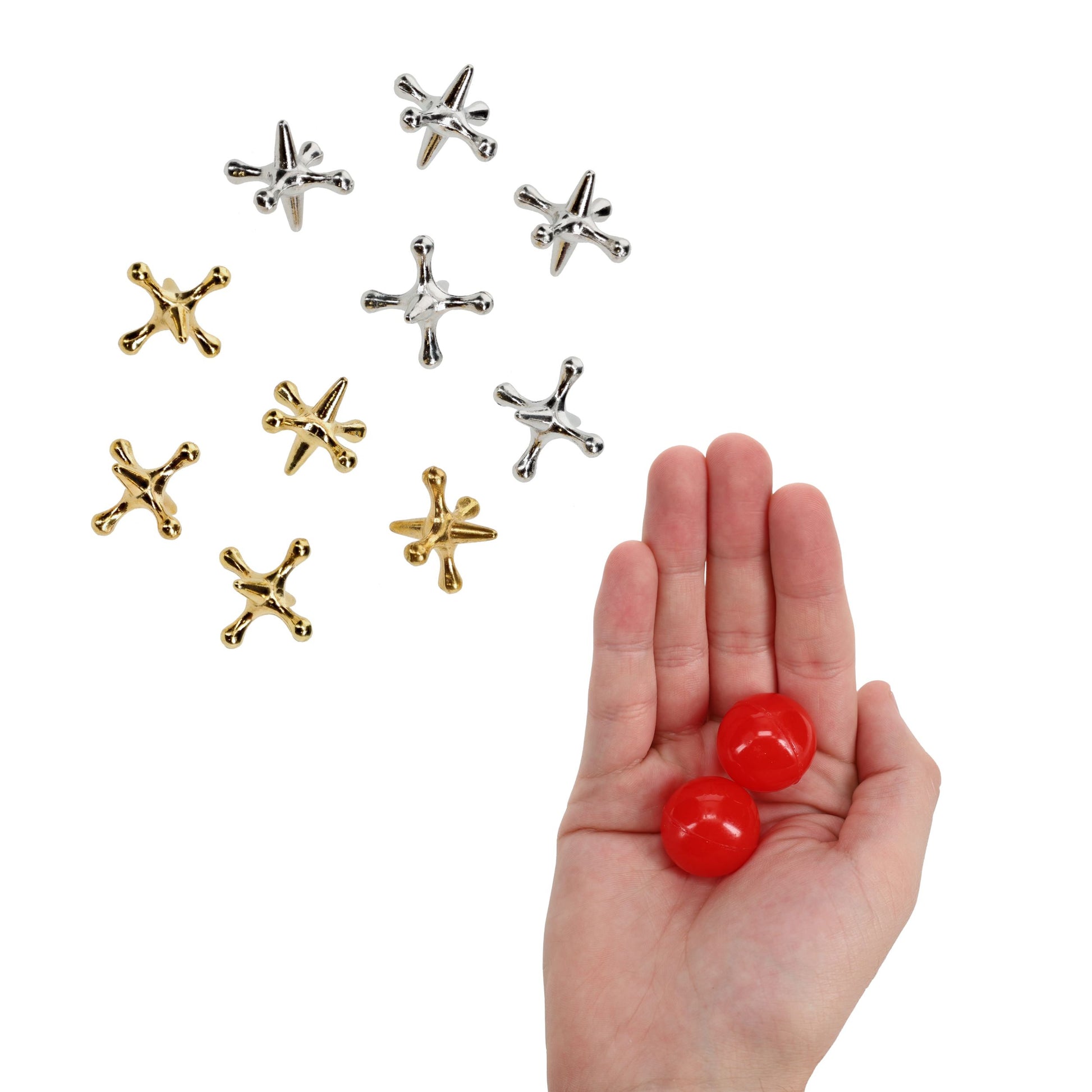 - Includes 5 silver and 5 gold jacks with 2 red bouncy balls