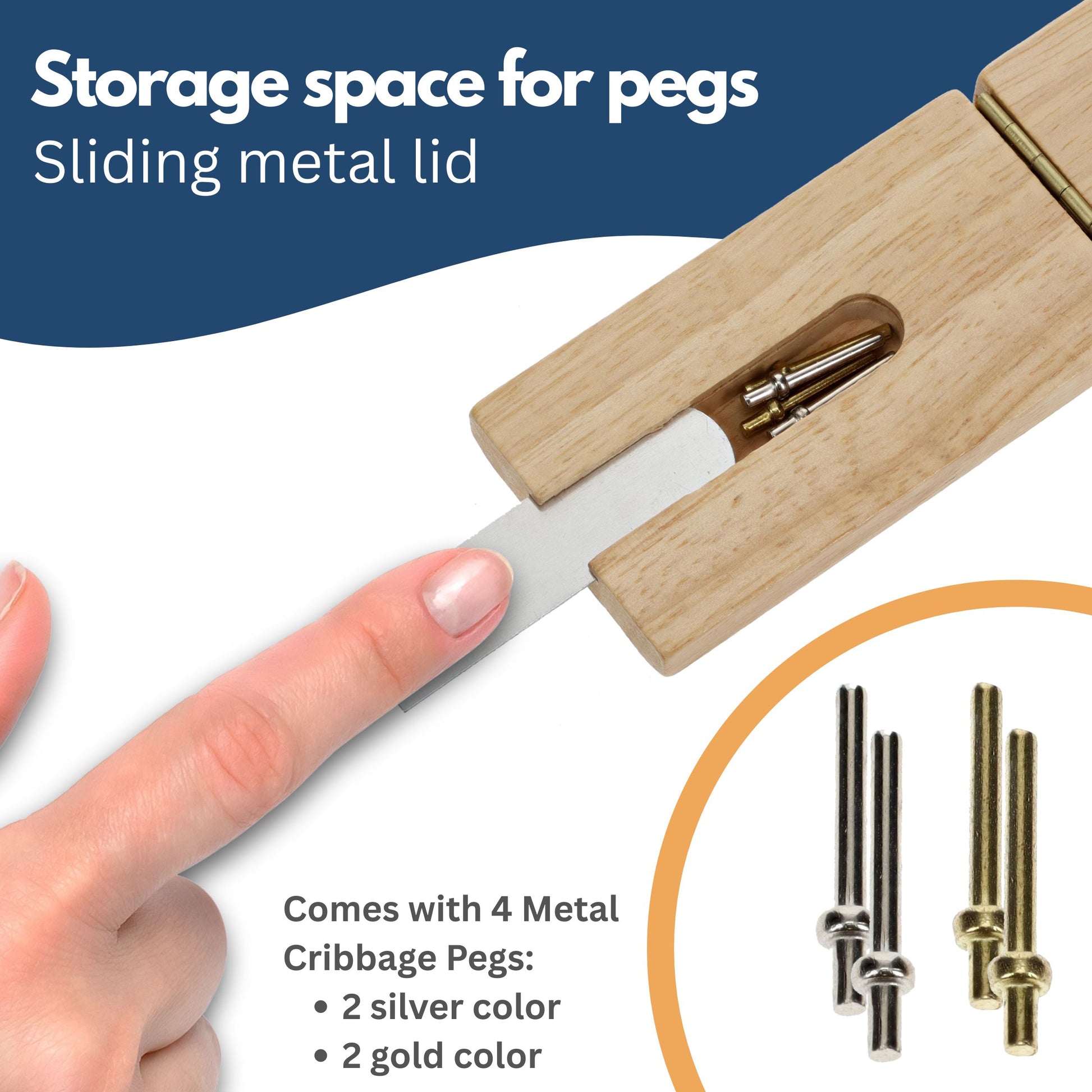 Classic simplicity, wood construction and small design make this a popular little cribbage board for anyone who enjoys playing cribbage on camping trips or while traveling the globe. The cribbage board has two tracks, folds in half, and has a storage space for the metal scoring pegs. Cribbage is a card game distinctly known for the cribbage board, or crib used for scorekeeping. It contains a series of holes known as streets, lanes, or tracks on which the score is tallied with pegs, or spilikens. Points are registered by pegging the score along the cribbage board.
