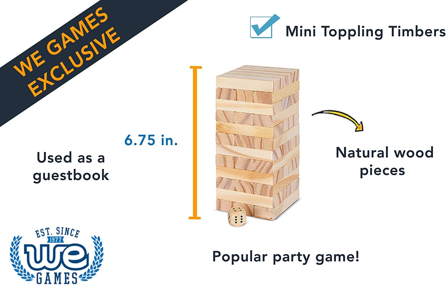 This is the mini-version of the larger block stacking party game. Put your steady hand and balancing skills to the test by carefully removing wooden blocks from the stack one at a time. A great game that is simple to learn and everyone in the family can participate. Includes one wooden die to be rolled for determining who goes first. Game too easy for you? Make it a challenge by rolling the die to determine how many pieces the player must remove during one play. Suspenseful and exciting with guaranteed laughs! Build the stack, and take turns pulling blocks and then stack each piece on top of the stack .The set includes 36 wooden pieces made from natural wood. Comes with a wooden storage box with sliding lid. Stack the pieces into the wooden box by placing three blocks per layer crosswise. Simply remove the sliding wood piece from the bottom for easy game set-up. Impress with this unique option for any birthday, graduation, easter basket, baby or wedding shower. An alternative to a traditional guest book, where guests write their well wishes on a blank block. This is also an excellent gift for groomsmen or as a 5th wedding anniversary. Whether it is with friends in the bar or family in your living room, this classic game has entertained happy people around the world for decades. The durable blocks are great for educational settings and indoor recess for elementary aged kids, and can also be played outdoors.