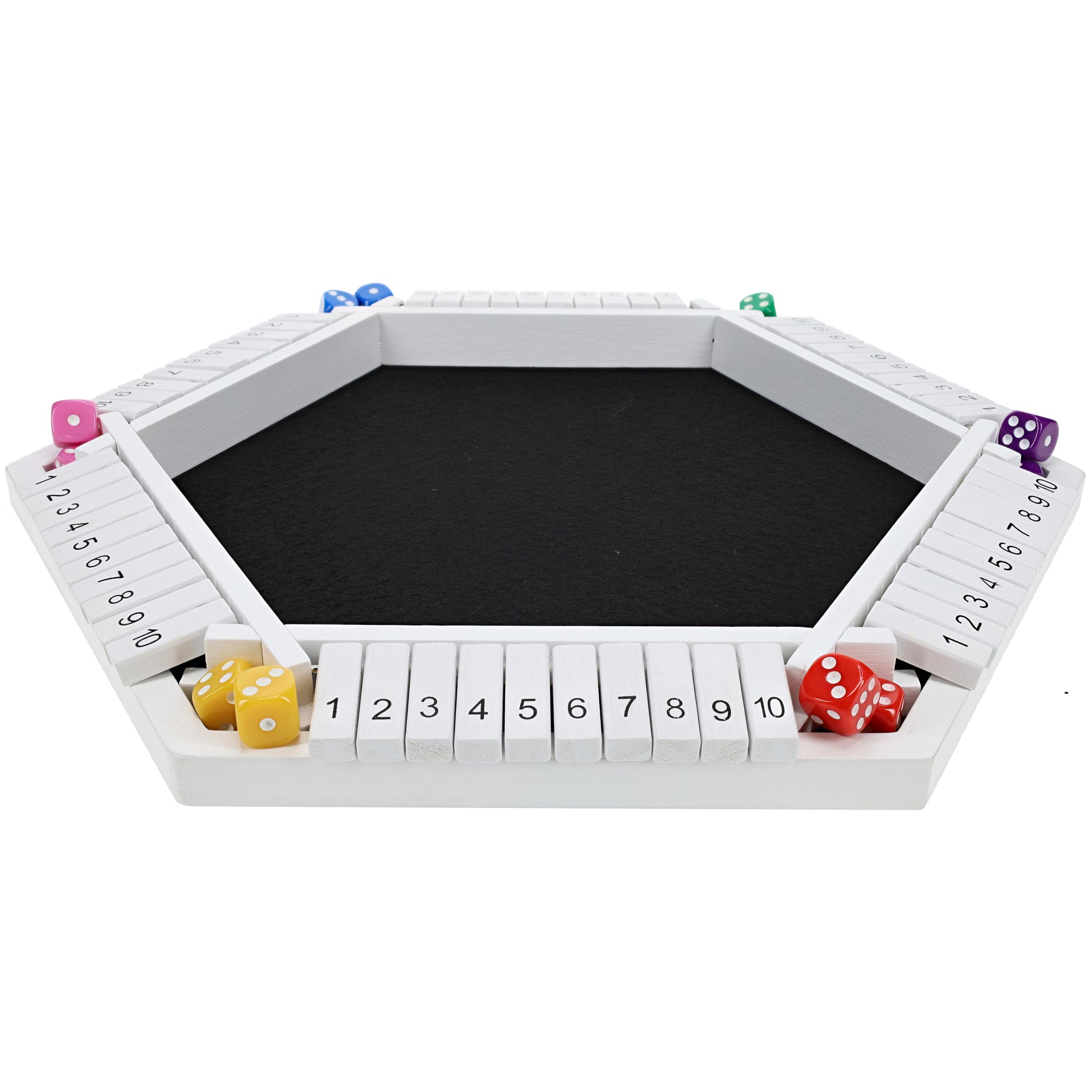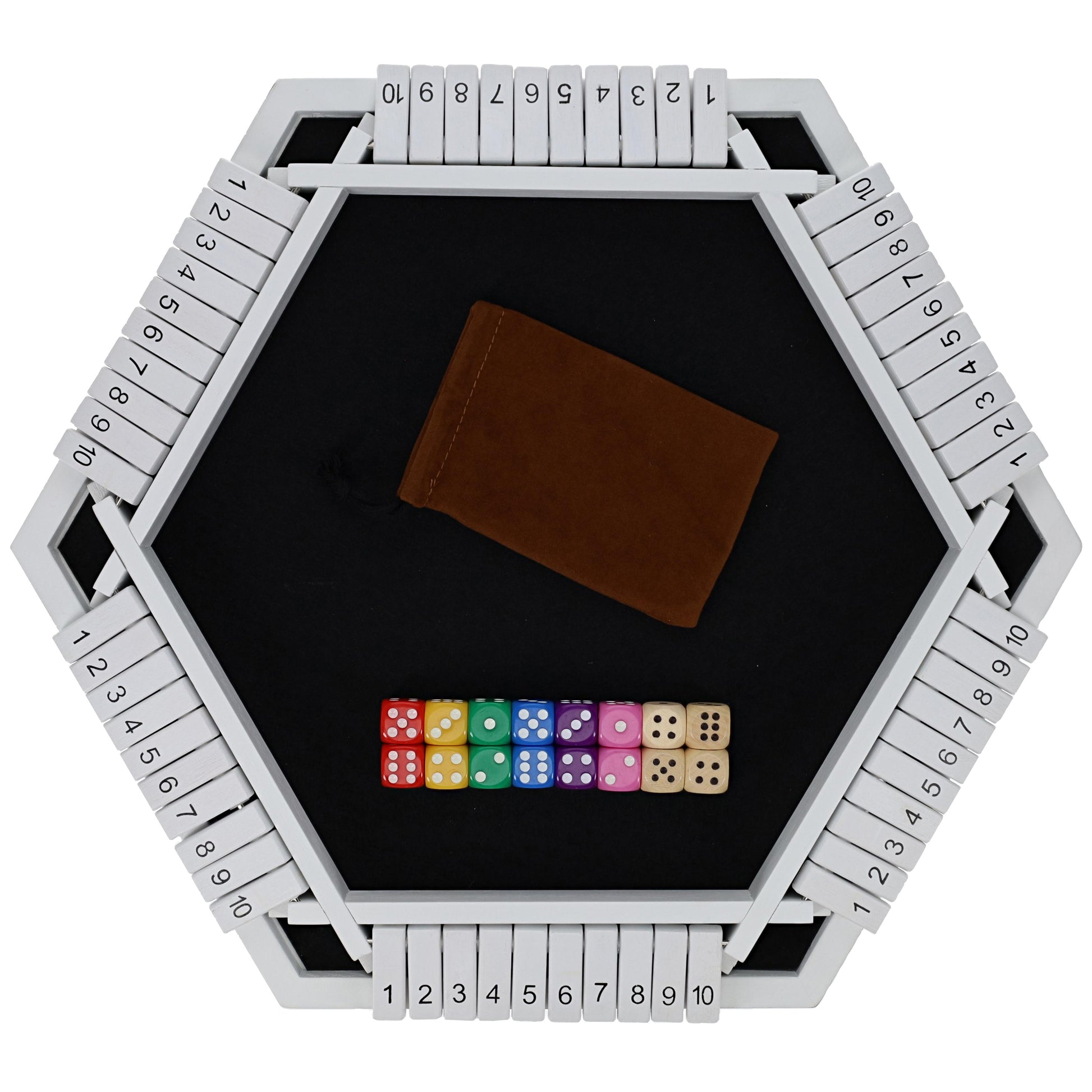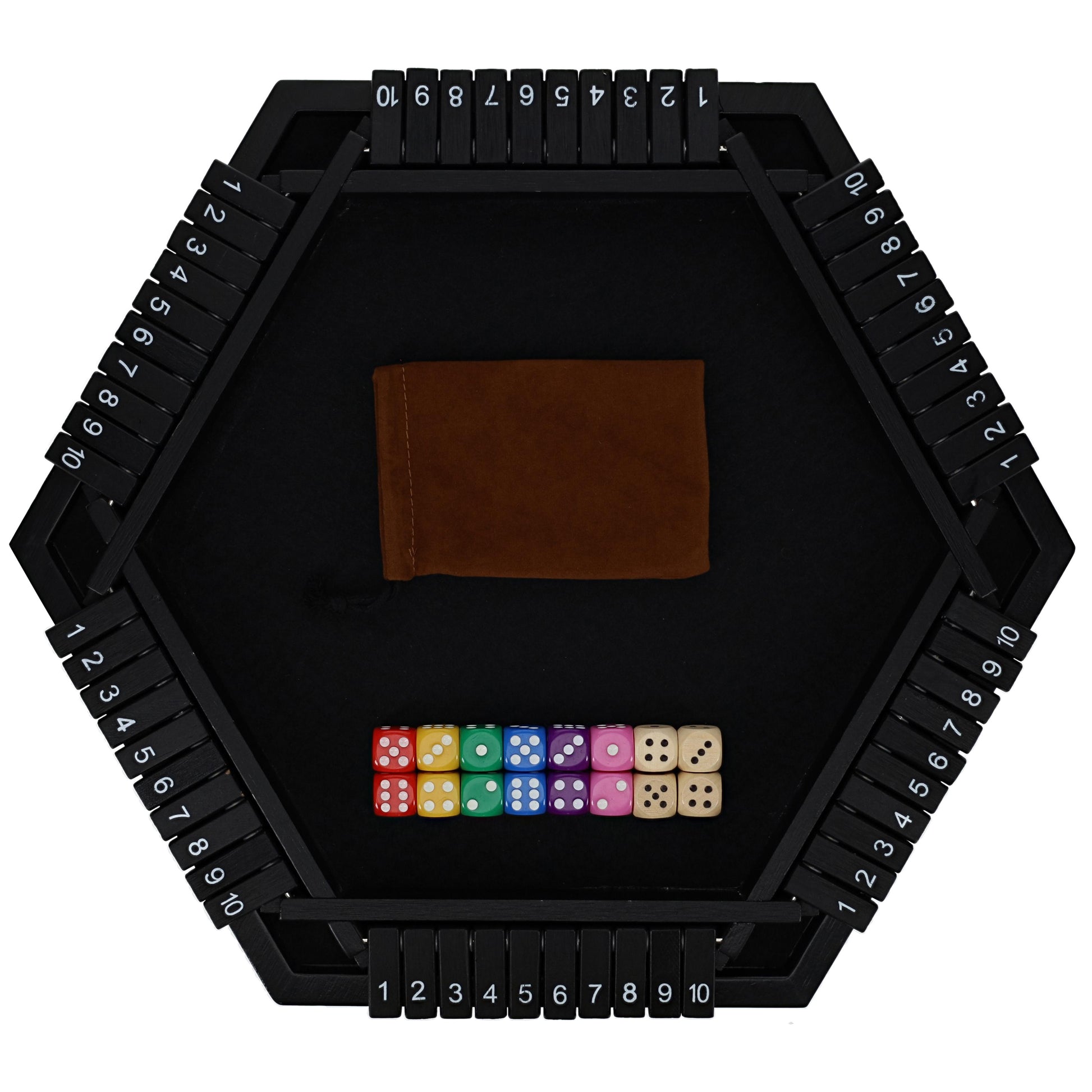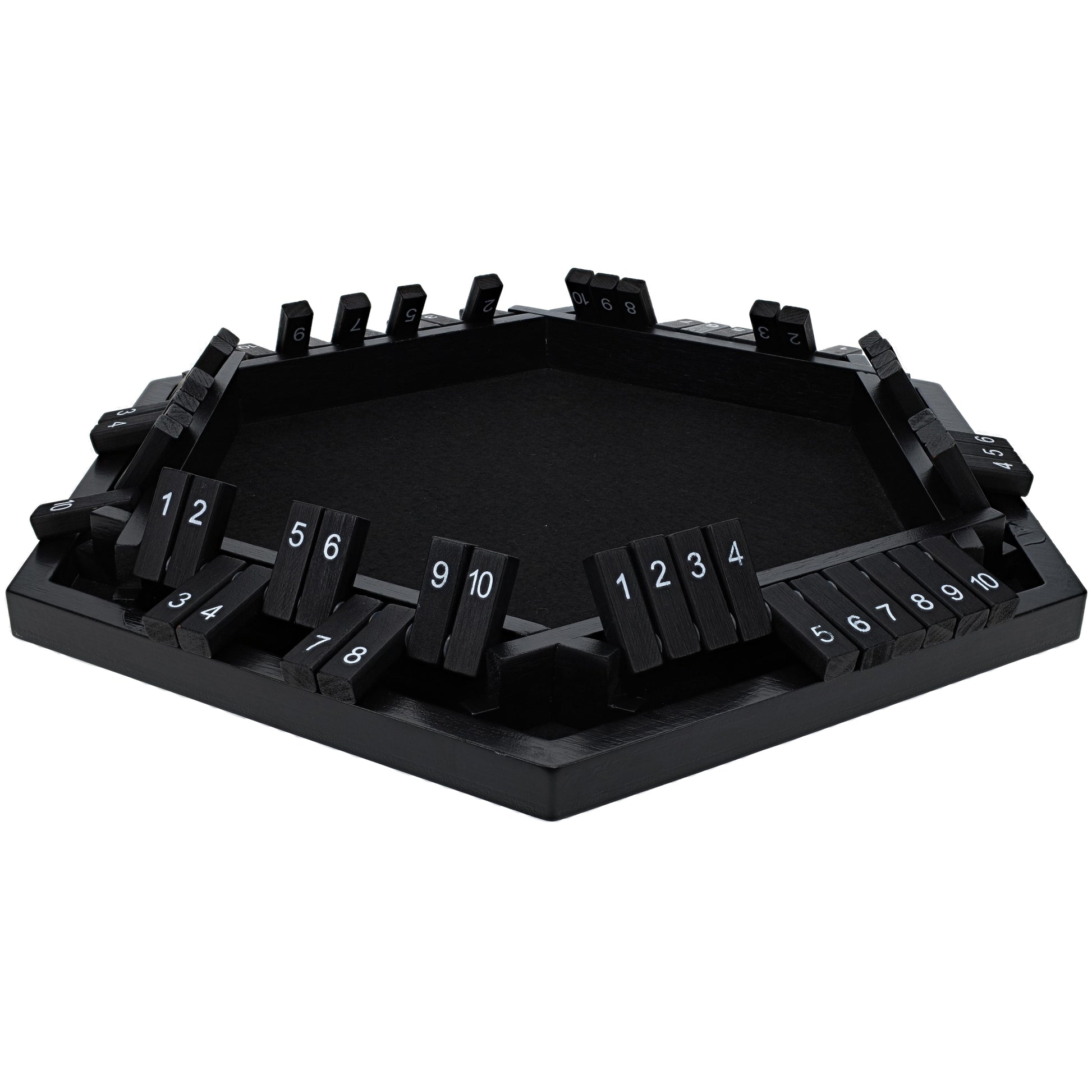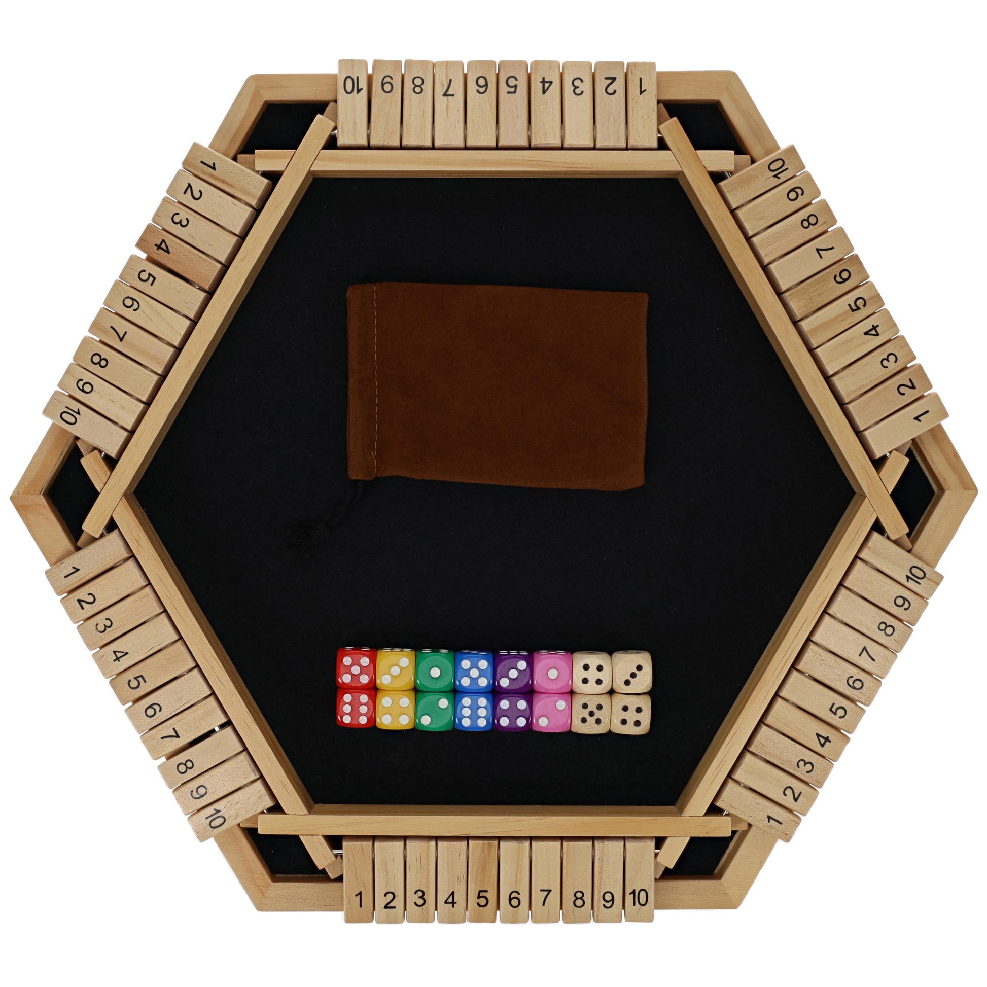 Introducing the ultimate game of chance and strategy - the Shut the Box game for 6 players! This classic tabletop game is perfect for family game nights, social gatherings, and competitive play. The objective is simple yet addictive - roll the dice and systematically “shut" the numbered tiles on the wooden game board, trying to reach the lowest score or shutting the box before your opponents. With 6 players, the game becomes an exciting race to see who can strategize and roll their way to victory first. The game set includes a sturdy wooden game board with 6 sides and 10 numbered tiles (1-10) for each player, 12 standard six-sided dice in different colors, and detailed instructions for 6-player gameplay. Whether you're a seasoned Shut the Box enthusiast or new to the game, this 6-player version promises hours of engaging, brain-teasing fun for the whole family. Challenge your friends, family, or colleagues and see who has the skills to "shut the box" and emerge victorious!