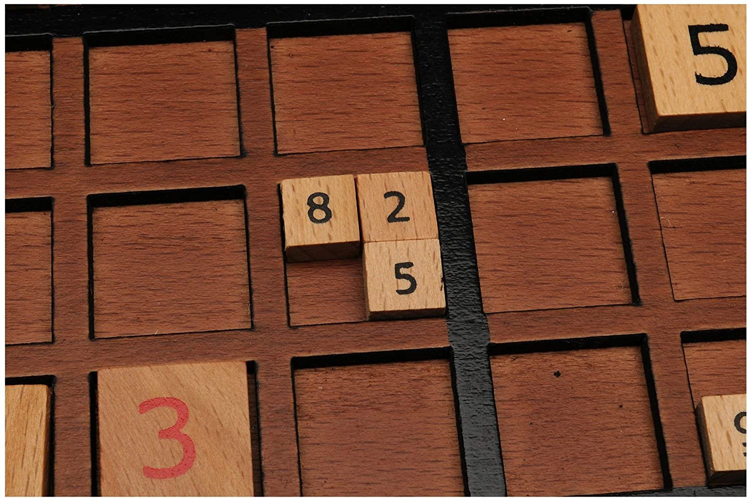Sudoku is a worldwide hit, and now we've made it even easier for the whole family to enjoy. This handsome Sudoku set features a simple design on a Walnut stained wood board. It features convenient slots along the edges of the playing surface to store your numbered wooden tiles in numerical order. A black Sudoku grid is printed on the surface. Comes with wooden number tiles plus small thinking tiles to hold your place while you determine the correct number for that space. Comes with a cloth bag with drawstring to hold the pieces when not in use. Big tiles measure: .734 x .727 x .196 inches; Small tiles measure: .358 x .357 x .103 inches. Any Sudoku puzzle can be played on it, so use the puzzle that came in your daily newspaper, put down your pen, and enjoy this tactile way of solving the puzzle.