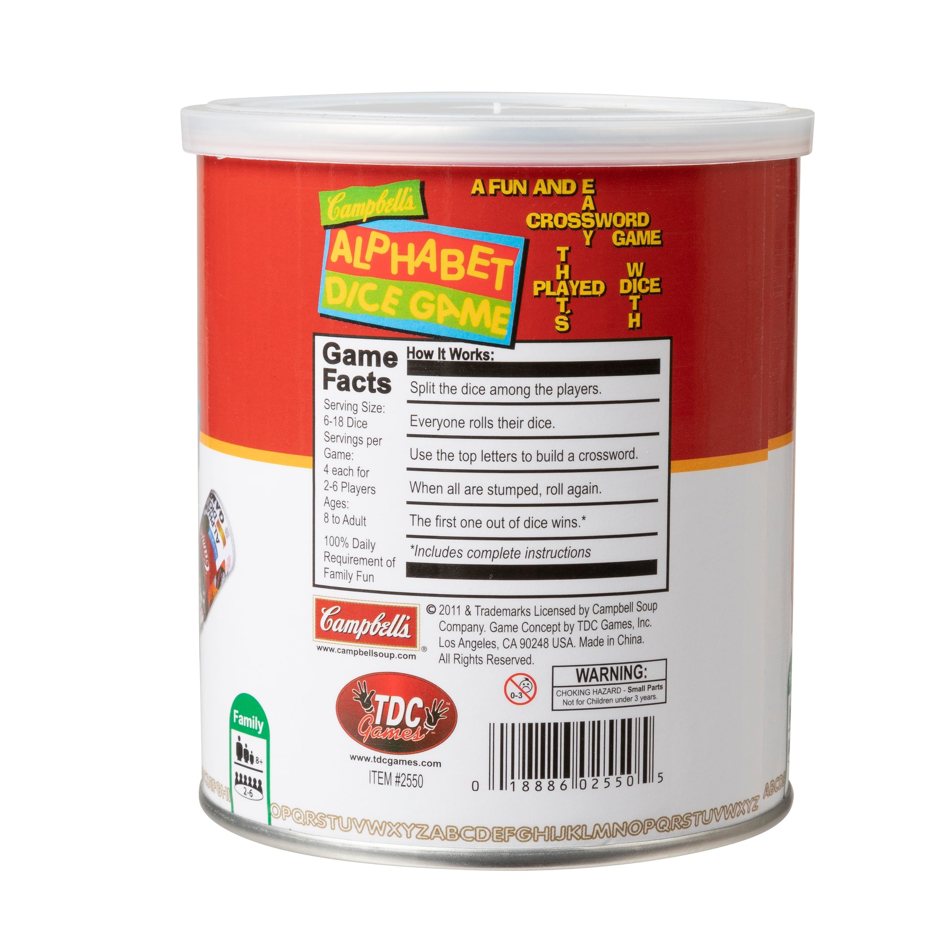 - Includes 36 alphabet dice stored in a CampbellÕs soup can