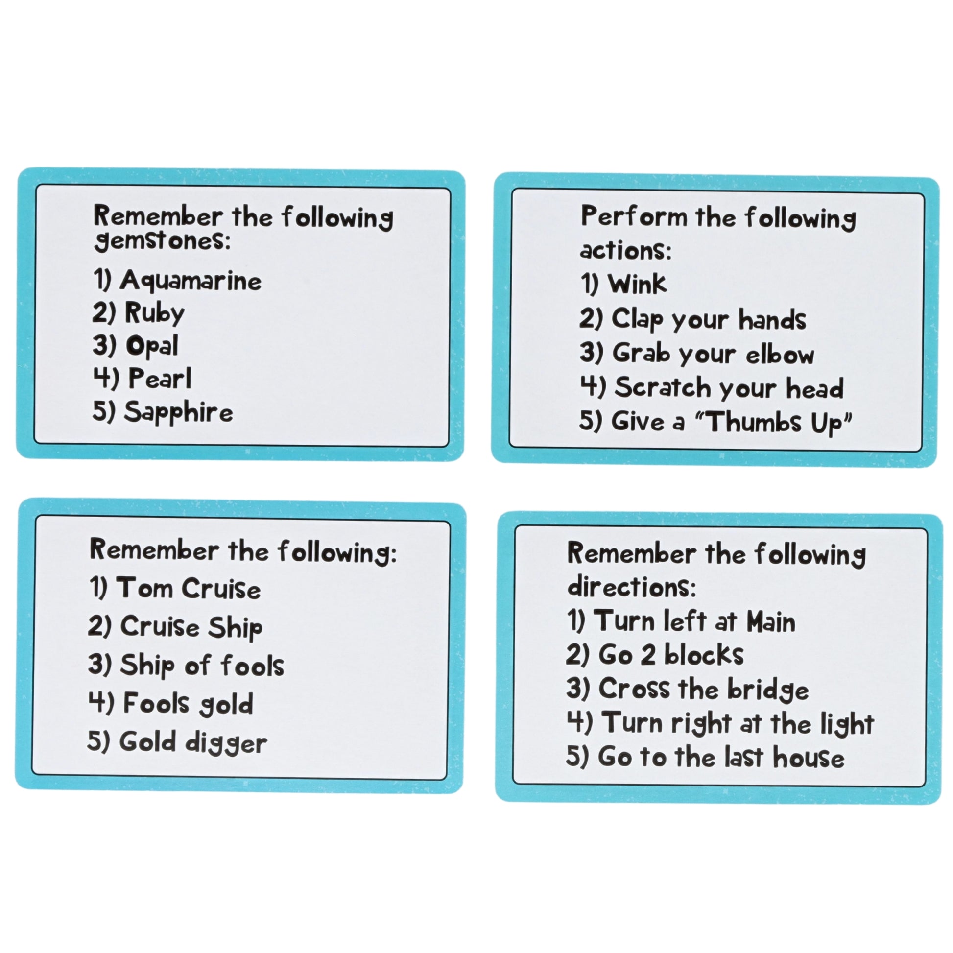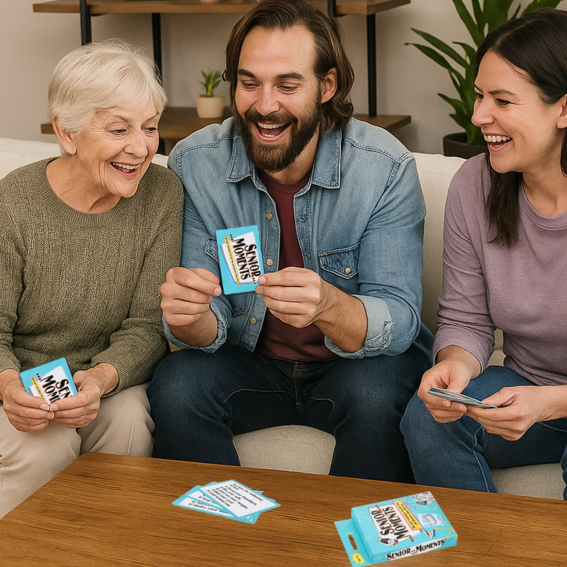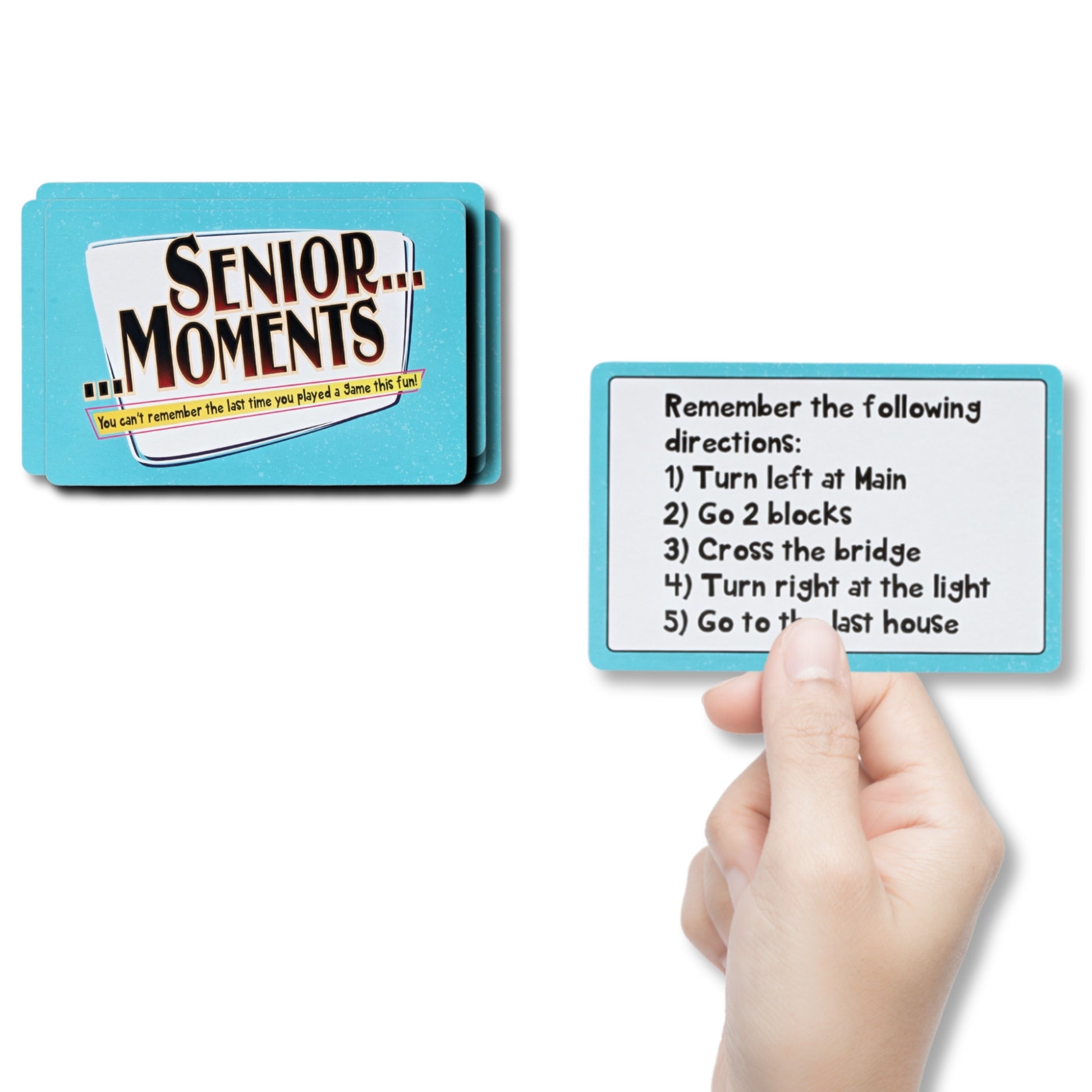 Senior Moments Travel Edition is a compact, quick-play memory challenge card game themed around classic “senior moment” jokes—with a friendly, pop culture twist. The oldest player starts as the active player. The person to their right is the reader and draws from the deck. If a Special Card appears, the reader keeps it to use later and draws again until a Memory Card is pulled. The reader then reads the Memory Card twice, slowly and clearly. The active player must repeat the list of items—or perform the listed actions. Score 1 point for each item remembered or action performed correctly. Play continues clockwise until someone reaches the agreed point goal. After the first player hits the goal, everyone else gets one final turn to try to match or beat it. If there’s a tie, those players go head-to-head, taking turns reading lists to each other until one misses—last one standing wins.