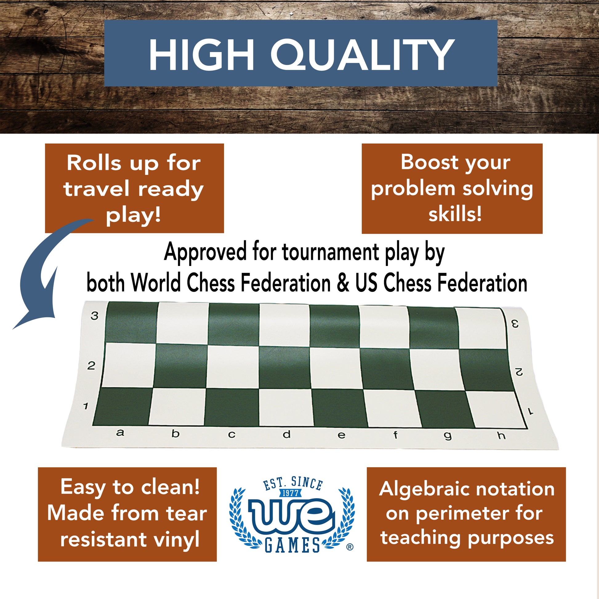 You will see people playing on this style of roll-up board in parks across the world. This particular board is made of a sturdy vinyl that will last through years of tournament and practice play. Complete with algebraic notation on the perimeter of the board to simplify lessons and study past games. Full sized board measures 20 in. with 2.25 in. squares. The chess mat is made of tear-resistant vinyl, which is easily wiped clean. Considered the standard for tournament play, it is a favorite for chess clubs and scholastic chess programs. This chess mat meets the World Chess Federation's (FIDE) and the US Chess Federation (USCF) proportions standards for tournament play.