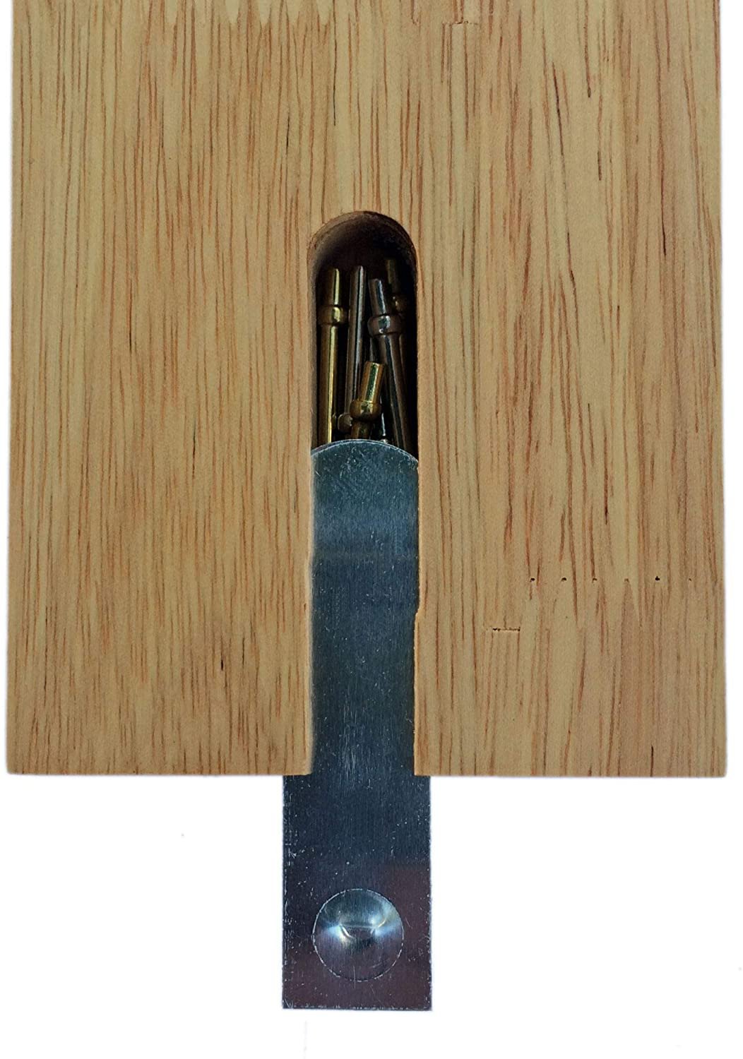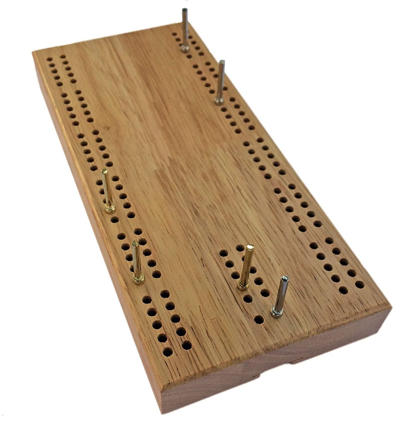 The classic simplicity, functionality, and beautiful construction make this the perfect travel set for real cribbage players who enjoy playing the game while traveling the globe. The 2-player board is crafted from solid hardwood and includes scoring section in the middle of the board. A clever storage compartment with a metal sliding door stores the pegs beneath the board so they will never be lost. Six metal pegs (3 silver, 3 gold)add a touch of class and are superior to the average plastic pegs that accompany many lower quality travel cribbage boards. Comes with a deck of playing cards, instructions, and a cloth drawstring pouch for storing.