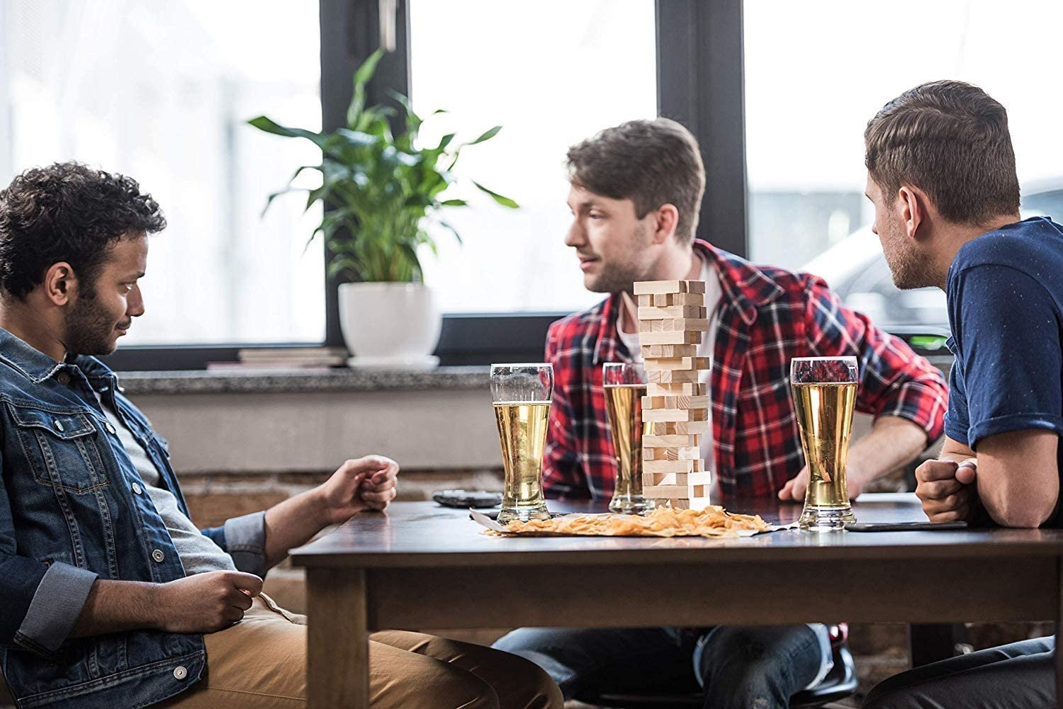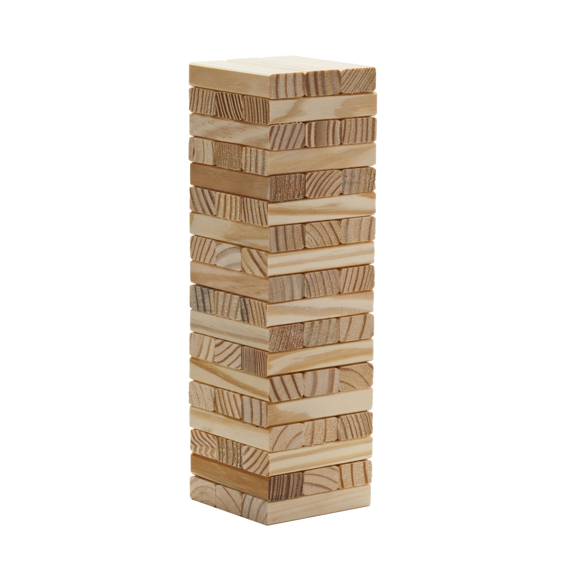 Put your steady hand and balancing skills to the test by carefully removing wooden blocks from the stack one at a time. A great game that is simple to learn and everyone in the family can participate. Includes one wooden die to be rolled for determining who goes first. Game too easy for you? Make it a challenge by rolling the die to determine how many pieces the player must remove during one play. Suspenseful and exciting with guaranteed laughs! Build the stack, and take turns pulling blocks and then stack each piece on top of the stack but don't be the one to make the timbers come jumbling down. Comes with a wooden storage box with sliding lid. Stack the pieces into the wooden box by placing three blocks per layer crosswise. Simply remove the sliding wood piece from the bottom for easy game set-up. Impress with this unique option for any birthday, graduation, baby or wedding shower. An alternative to a traditional guest book, where guests write their well wishes on a blank block. This is also an excellent gift for groomsmen or as a 5th wedding anniversary (wood). Whether it is with friends in the bar or family in your living room, this classic game has entertained happy people around the world for decades. The durable blocks are great for educational settings and indoor recess for elementary aged kids, and can also be played outdoors.