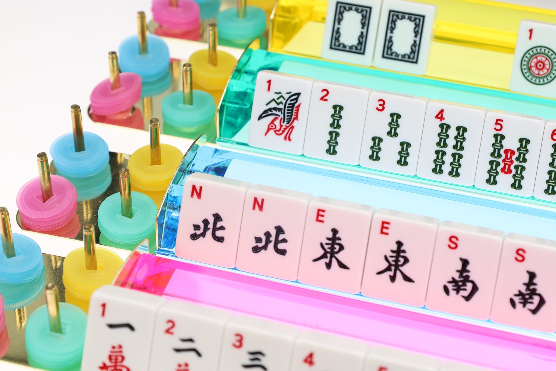 This set of four plastic MahJong racks in a colorful assortment will help you stand out from other basic racks and is an excellent option for any Mahjong player. This set comes with blue, green, pink, and yellow mahjong racks made from clear plastic. Combine with your favorite mahjong set!