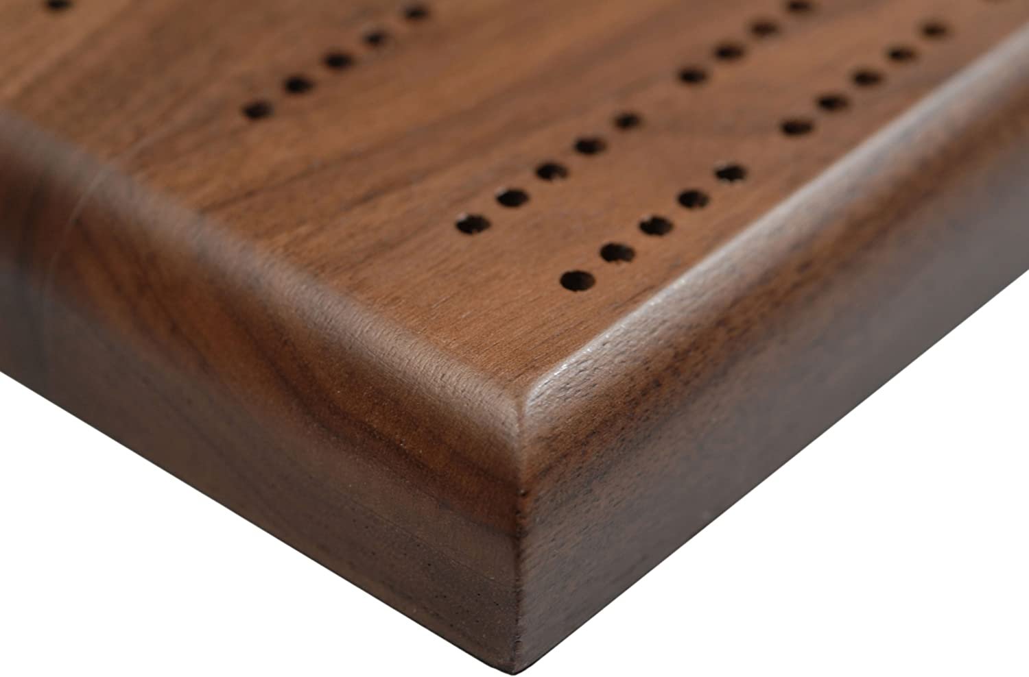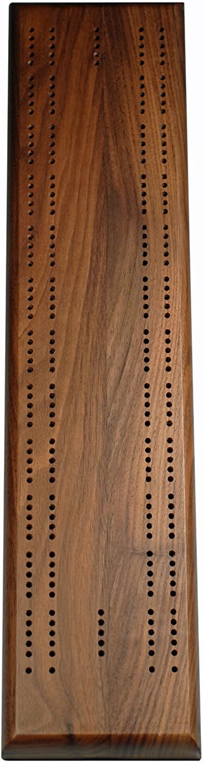 This deluxe, gift-quality cribbage set comes complete with board, cotton carrying bag, tapered metal pegs and a deck of cards. The beautiful 2 lane cribbage board is crafted from solid wood and is ACC Sanctioned for tournament play. This is considered a sprint styled board with 60 holes straight up and 60 holes straight back. The peg holes are precision drilled. There are additional holes in the center for tracking wins of multiple games. The peg storage compartment on the underside of the board is covered with a sliding metal door. In an effort to standardize the cribbage board, the American Cribbage Congress (ACC) recommends a cribbage board that is 60 holes long. The American Cribbage Congress (ACC) purpose of a standardized board is to decrease pegging errors and to help improve tournaments. This is a quality board that will make a great addition to your game collection.