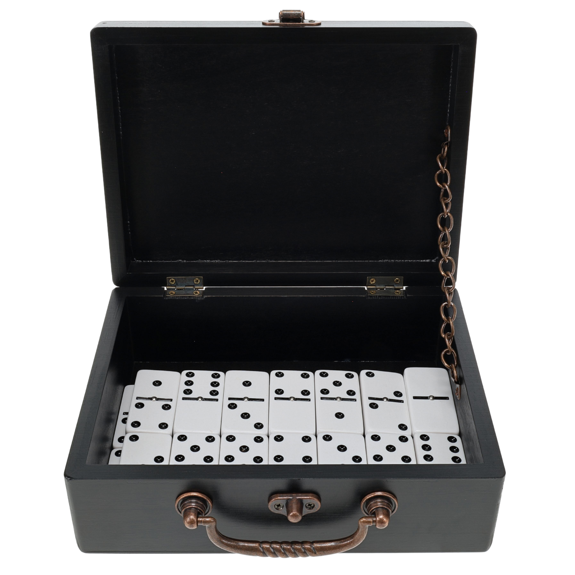 Dominoes is a tile game that can be played just about anywhere with a flat surface. Play it on the floor, at the park, or on the kitchen table. While it is enjoyed in many countries and cultures around the world, it is most popular in Cuba, Puerto Rico, and other Latin countries of the Caribbean. Play dominoes in style with this classic set of premium double-six dominoes. Enjoy the clicking sound of the tiles with their smooth surface and clean, black pips. Transport them in the black stained wooden treasure box with latch closure. A great addition for any vacation home, game room, or man cave, this is a gift that will be enjoyed for years to come.