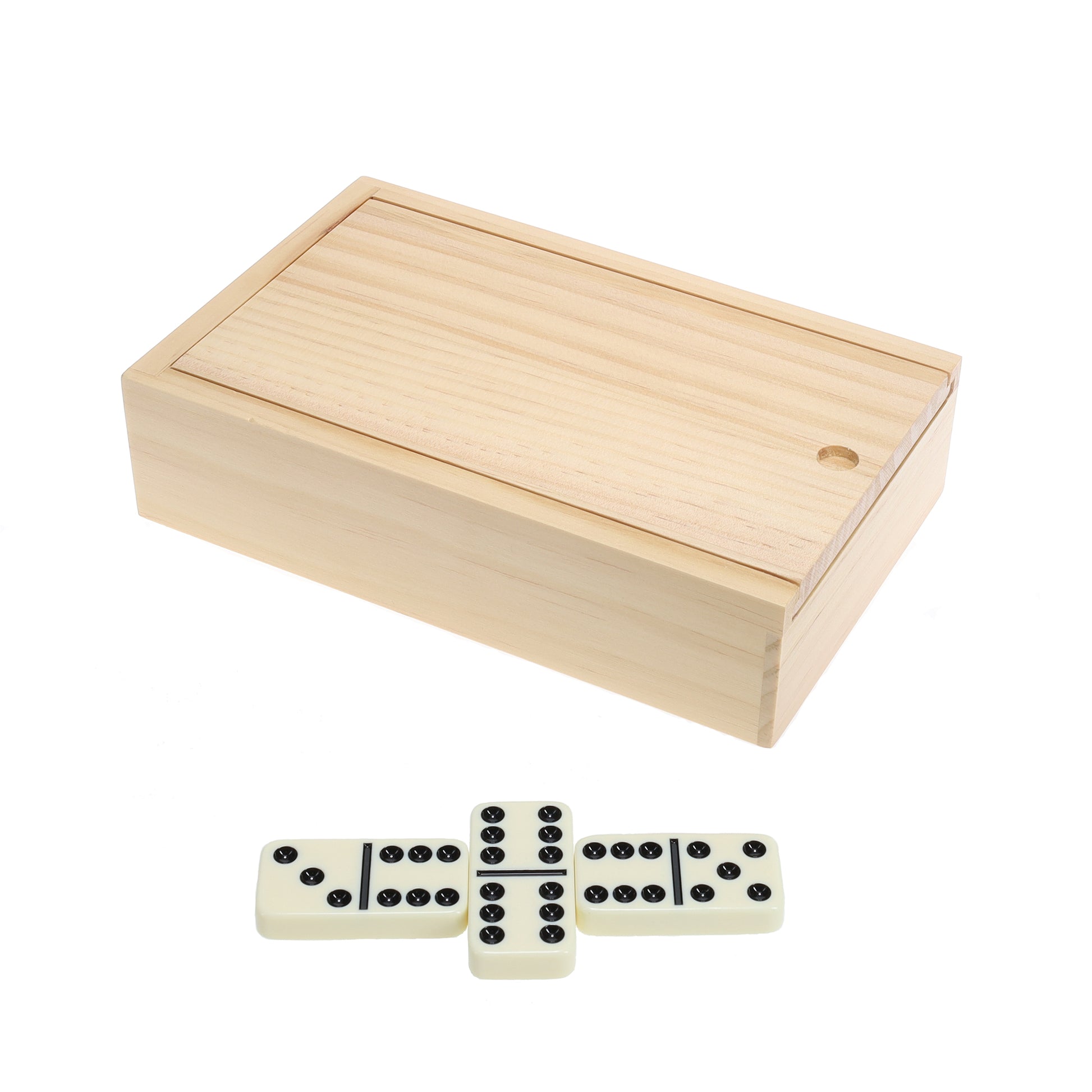 Everyone's favorite Double 6 Plastic Dominoes now come in a natural wooden box for easy, quality storage. Dominoesare descendants of dice. The bones became known as dominoes from their resemblance to the style of a classic black masquerade mask sometimes called a domino. Western dominoes typically include 28 bones, with six bones having blank sides. This represents the outcome of the throw of one die. Dominoes, like playing cards are extremely versatile. There is a wide array of games you can play with domino pieces, such as Draw Dominos, Mexican Train, Five-up, Matador, and Forty-Two just name a few.