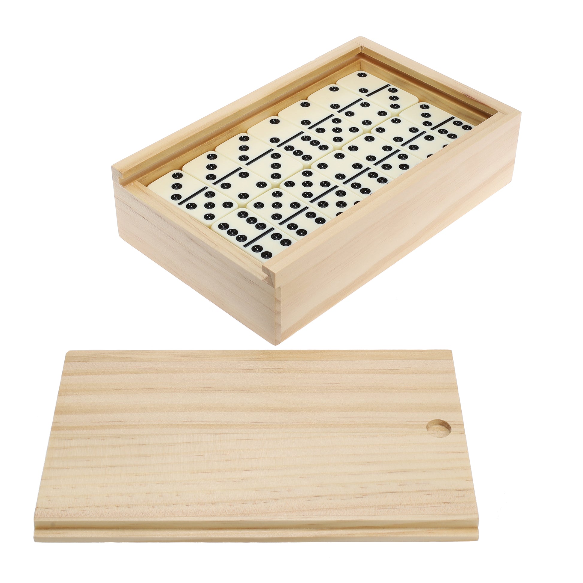 - DOMINOES: Includes 28 double 6 ivory heavy-duty plastic dominoes with black dots in a sturdy wooden case. Add some fun to your home decor, board game table, game room decor, or living room decor.