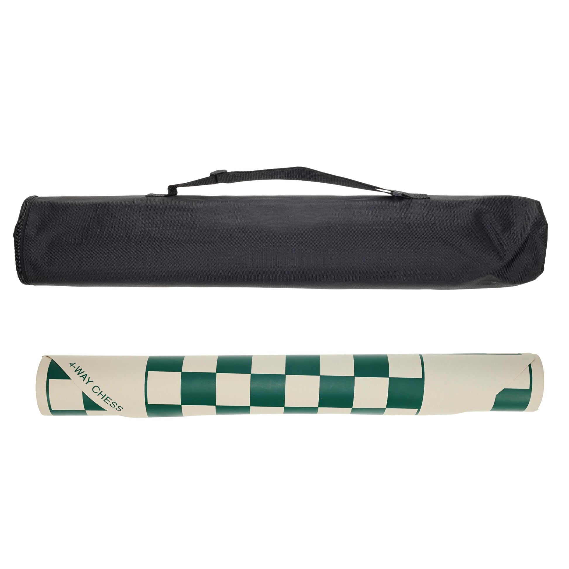 A twist on a classic, for 2-4 players. Object of the game is to capture the king, meaning there is no checkmate. Many variations of play are possible. Great set for seasoned players who are up for a challenge of strategic and tactical thinking. Includes a four-way roll up chess board and 4 sets of chessmen in navy blue, gray, neon green and red. Each chess piece color set includes 16 chess pieces and an extra queen. Plastic chessmen are classic Staunton style with felt bottoms and a matte finish to prevent glare. Includes a black bag with a shoulder strap for easy storage. Throw this set over your shoulder and enjoy the classic game with your favorite chess mates. Makes a great gift for families, classrooms or chess clubs.