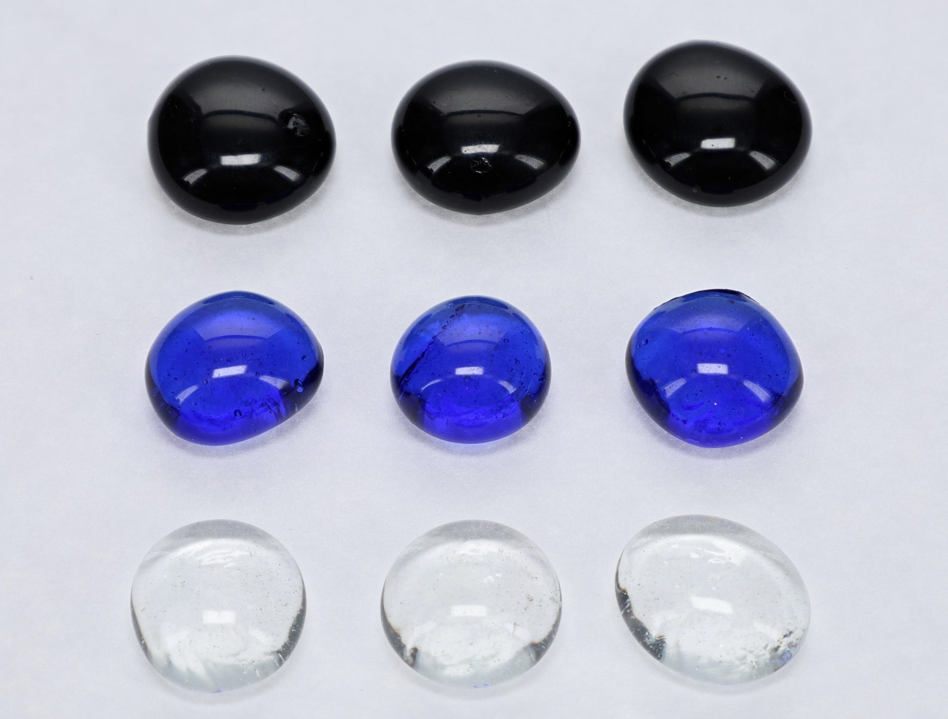 - 48-Piece Set: Includes 48 handblown glass stones in assorted colors: blue, black, and clear/white.