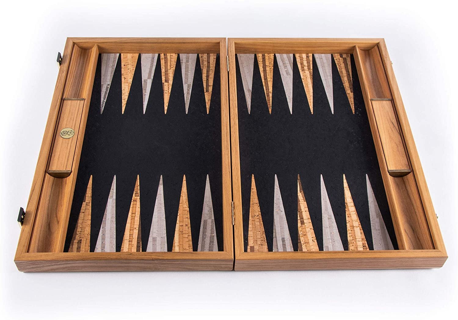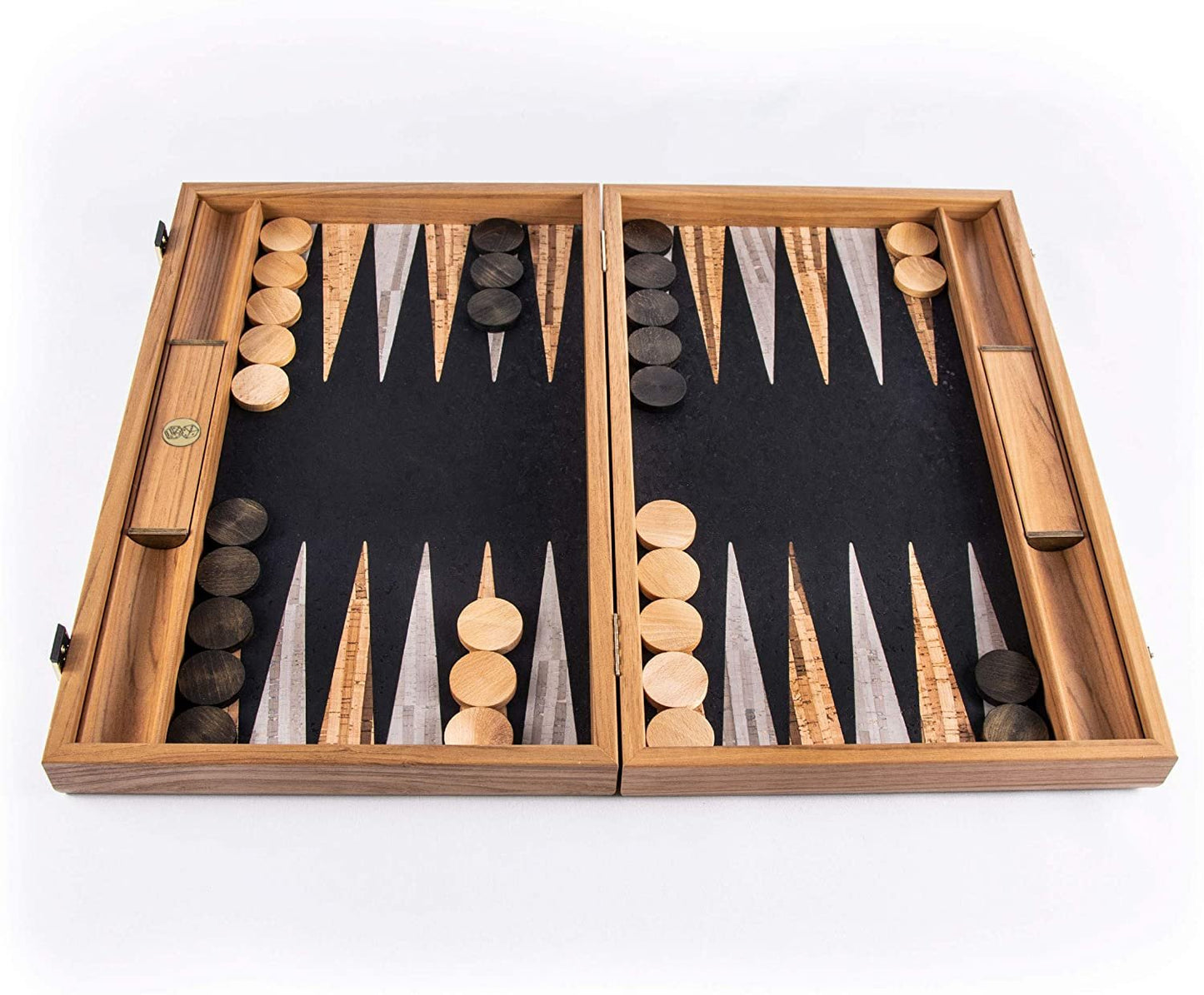 The cork backgammon effortlessly merges a natural product with a beautiful, contemporary design. The natural cork's lines bring the beauty and tranquility of nature. The playing field is a combination of dark brown cork with natural cork & grey inlaid points that makes each roll of the die a lot less noisy. This backgammon is handmade using the art of marquetry which is the art and craft of applying pieces of veneer to a structure to form decorative patterns and designs. The skillful workers use this method in order to create the inside design of the backgammon set. Features wood veneer and natural cork on the outside of the case. Interior features a dark brown cork playing field with natural cork & grey inlaid points. The checkers are olive wood.