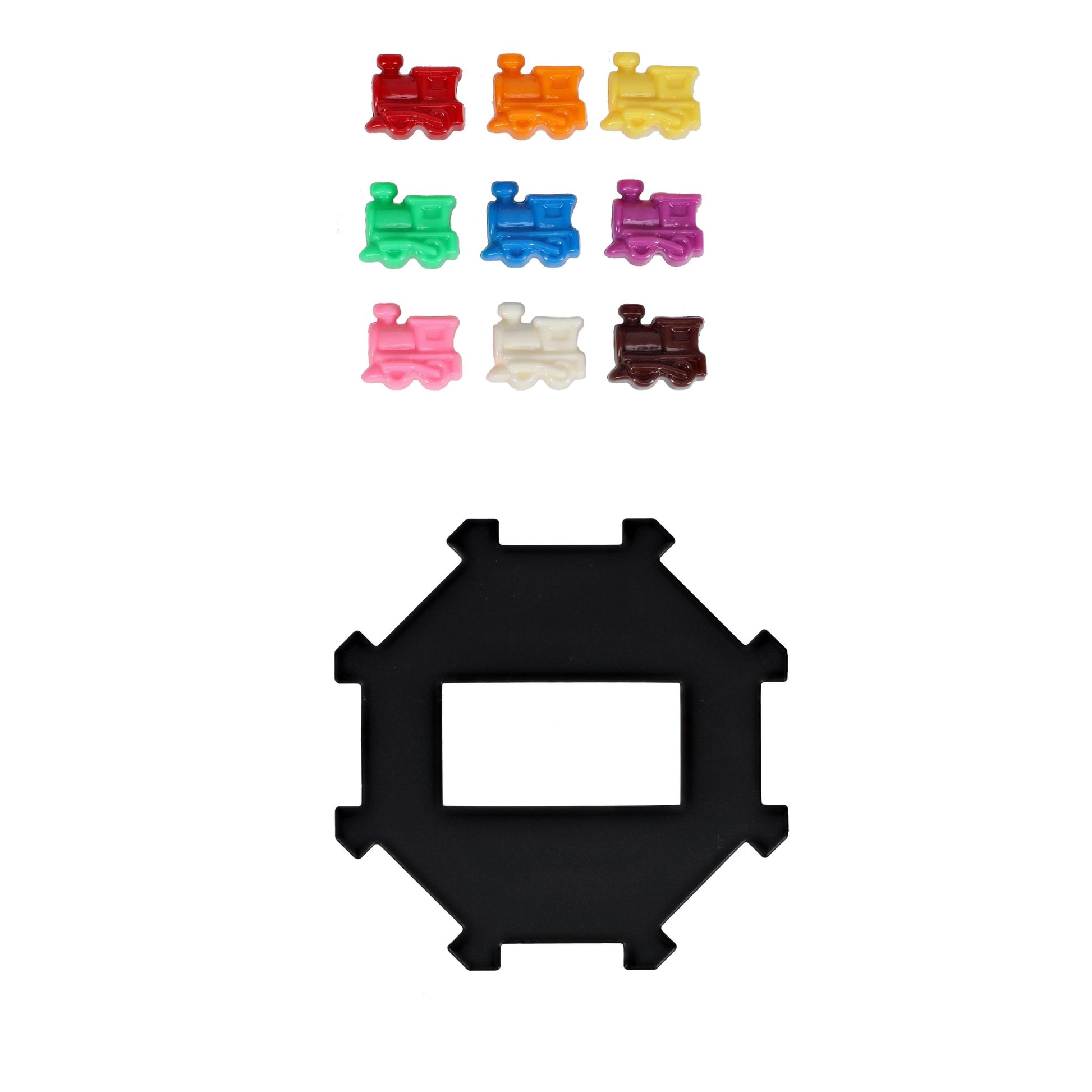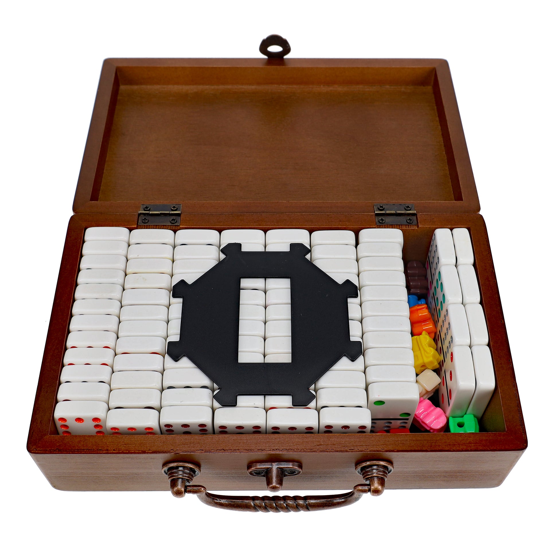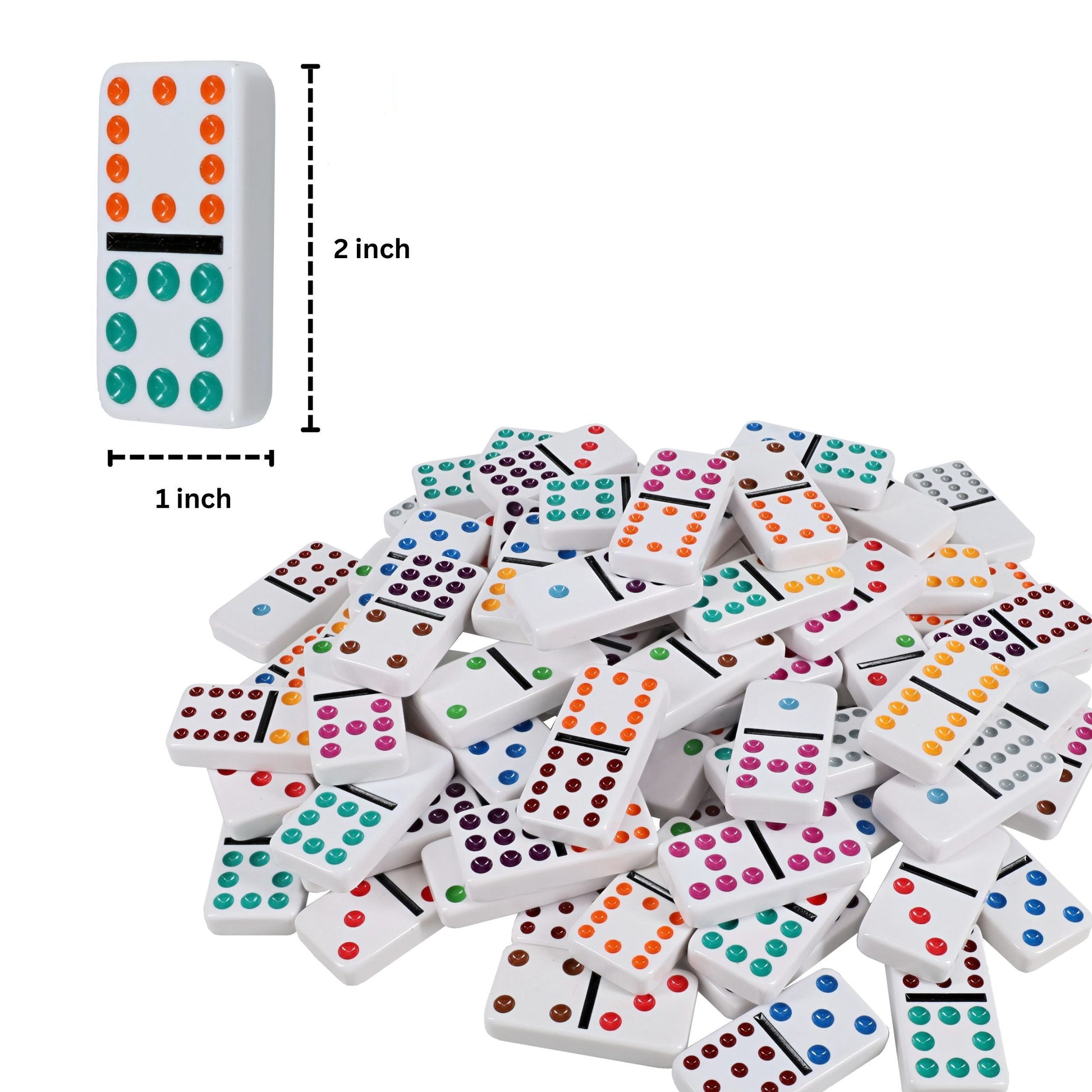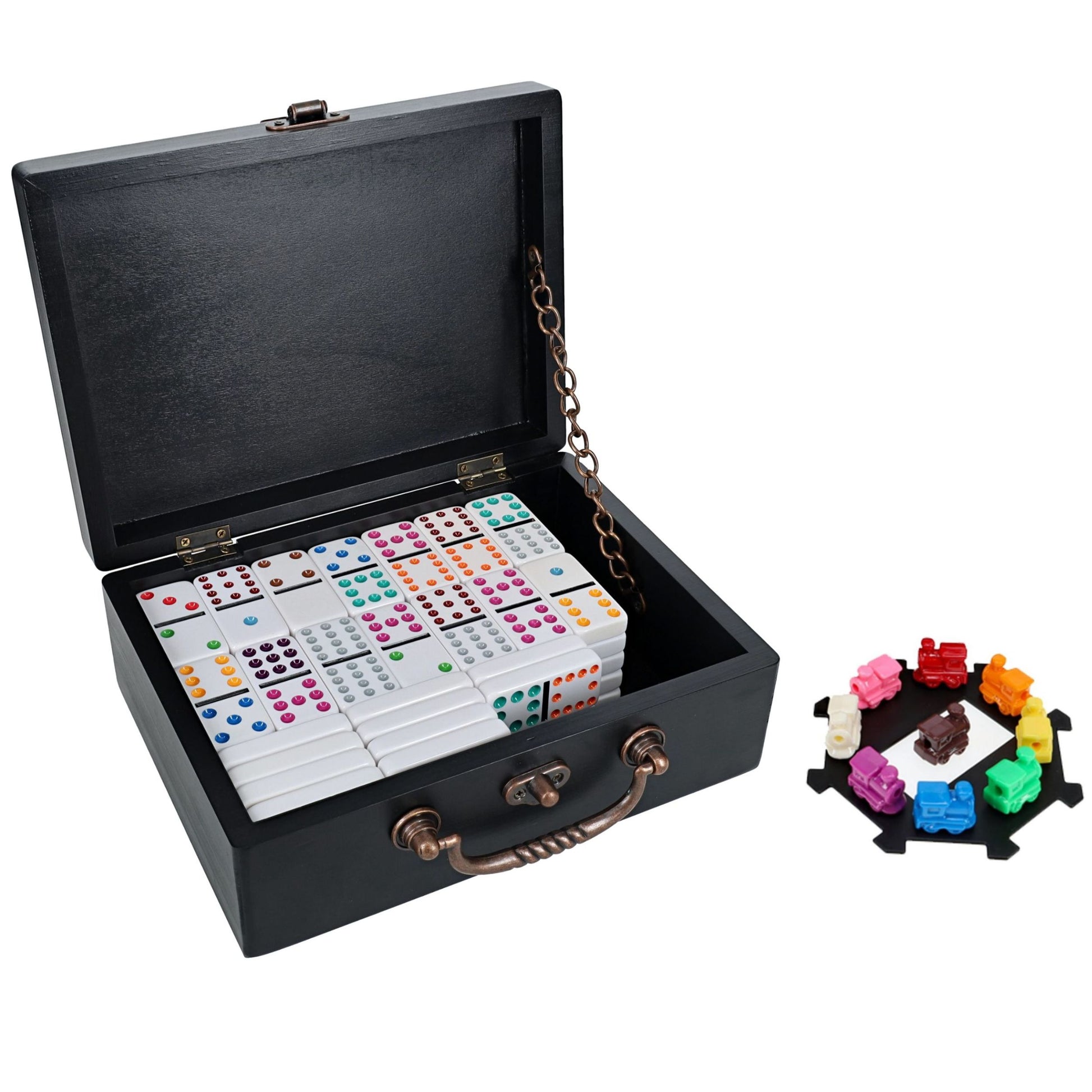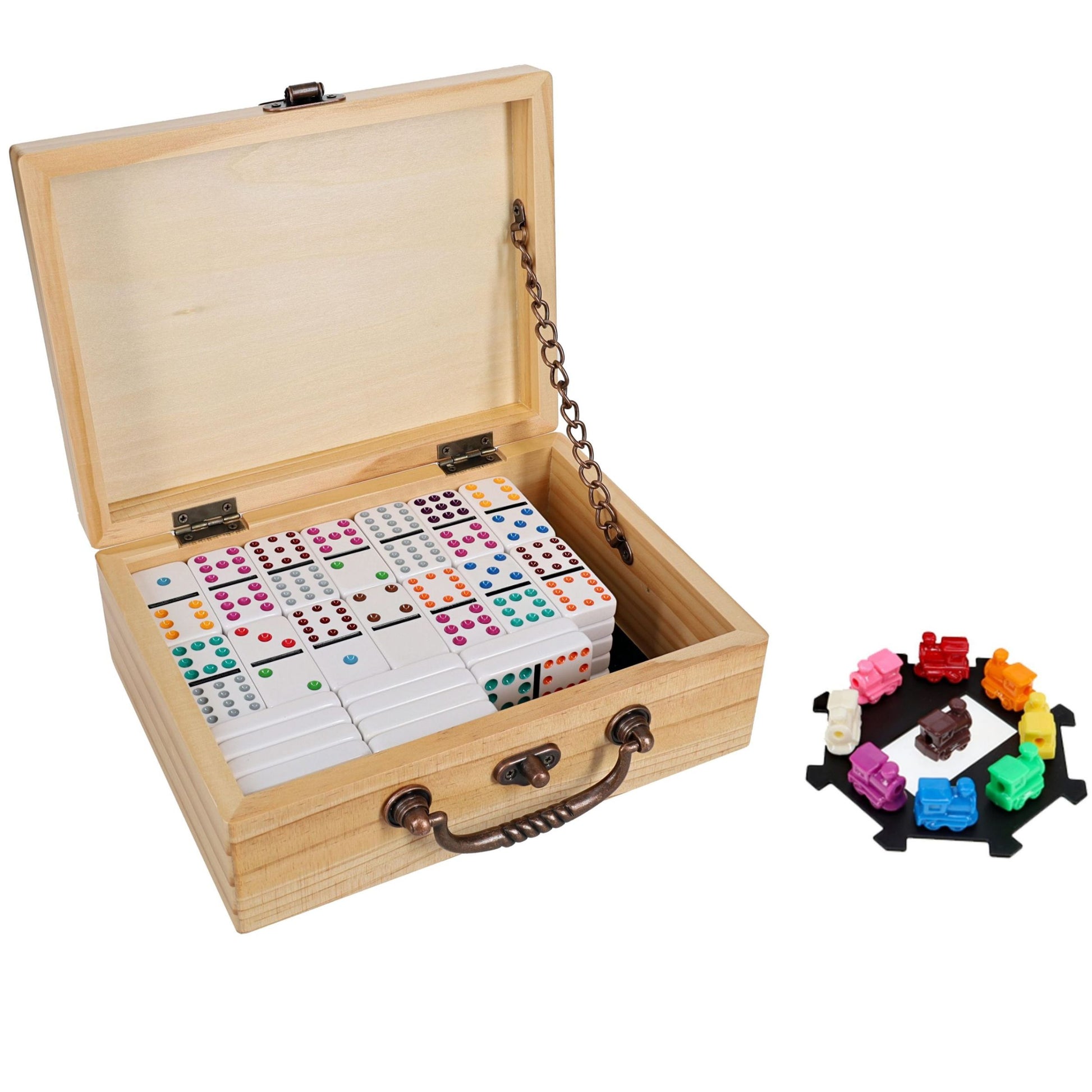 - ALL ABOARD: 91 double twelve ivory colored heavy-duty plastic dominoes with assorted color dots in a wooden treasure box with latch closure. Single domino measures 2.04 x 1.02 x .4in. and entire set weighs at 4.45 lbs. Enjoy the timeless game with 9 colorful train markers and train. With the quality and superior feel of the thick double twelve dominoes you can rest assured that they will provide you with hours of fun.