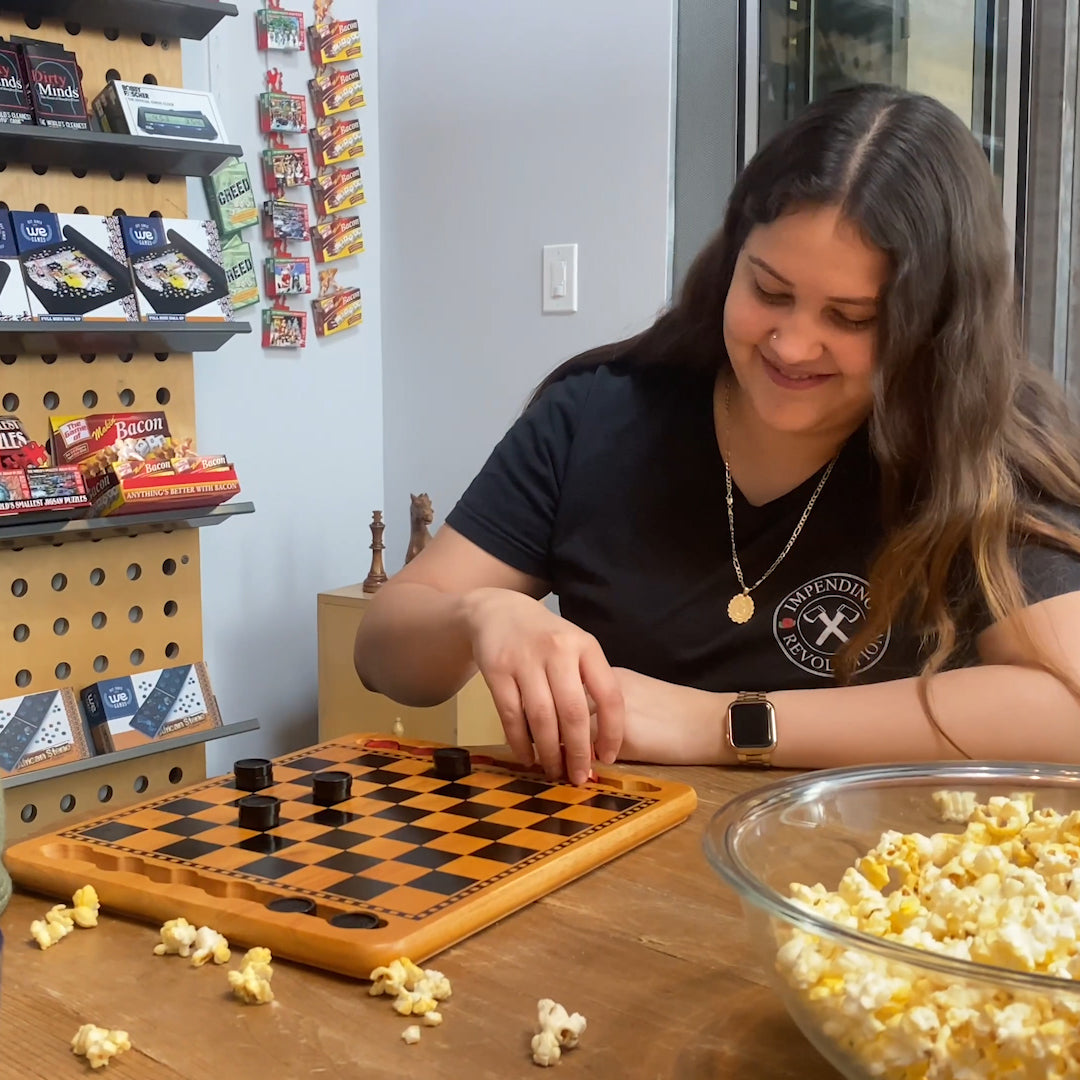 This solid wood checkers set with nostalgic red and black checkers is a timeless beauty. The solid wood board features recessed grooves for storing the wooden checkers. The hardwood board is a hefty weight and sturdy design to endure many years of enjoyment. While this is a great game for families and friends, checkers is an excellent tool for teachers. Many different skills can be taught playing checkers, such as cause and affect, logical thinking, and social skills, to name a few. Teachers prefer this game because of the sturdy wooden construction that outlasts cardboard sets. Makes a beautiful gift that will stand the test of time.