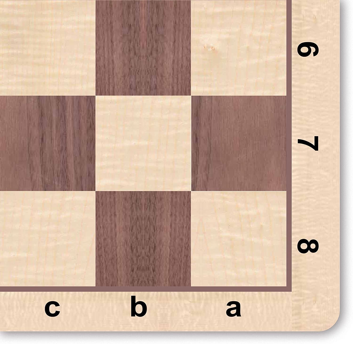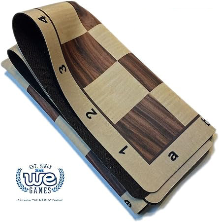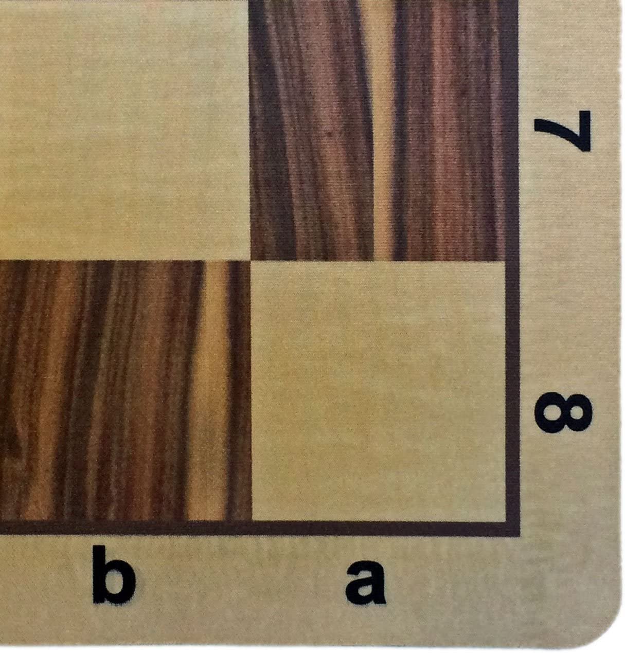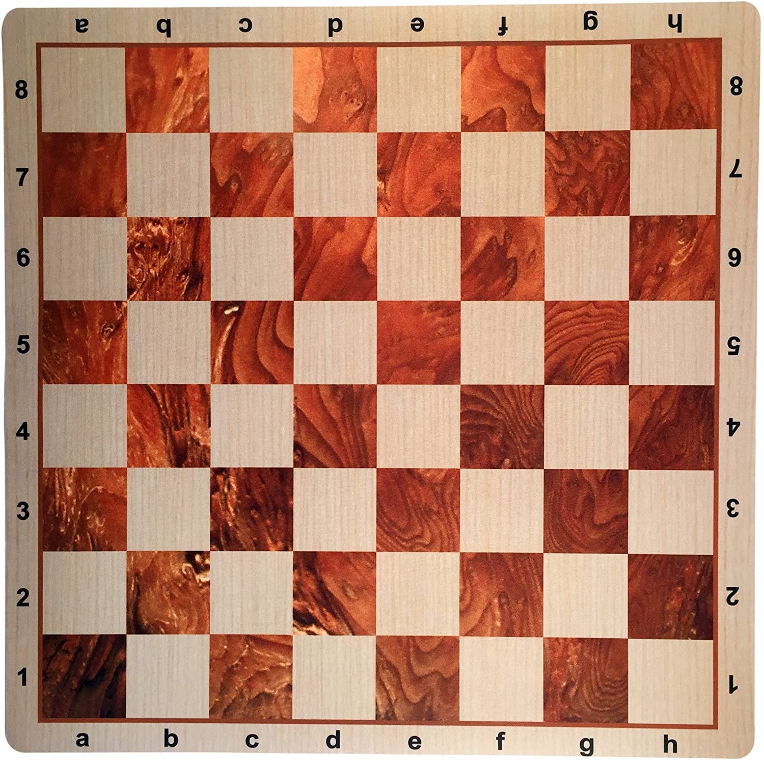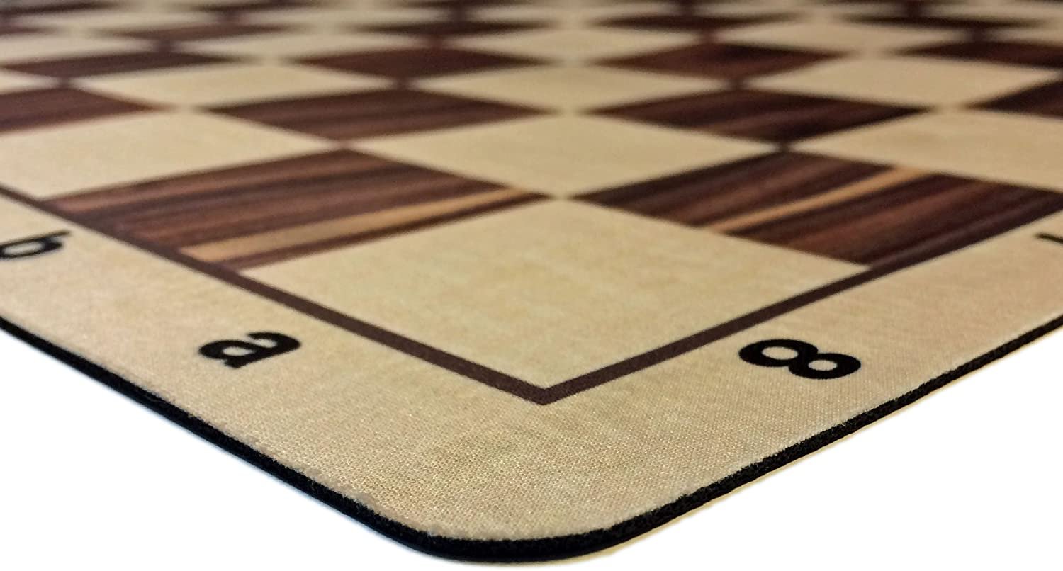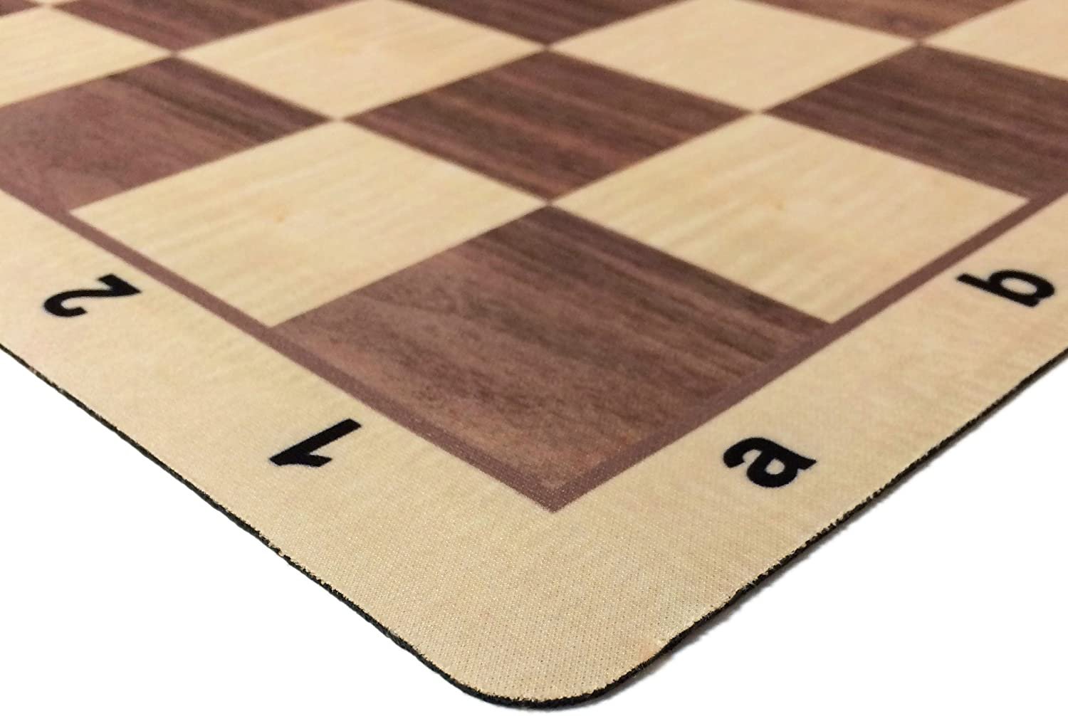 Made from the same material as a mousepad with a soft polyester blend surface and a rubber backing. Great option for playing outdoors as the corners will lay flat and the rubber bottom grips the table or playing surface. This beautiful mousepad chess mat is printed with a replica of wood grain. The wood grain will pair well with wooden pieces. We also recommend weighted pieces because the extra cushion and thickness of the board prolongs the lifespan of the weights. This chess mat meets the World Chess Federation's (FIDE) and the US Chess Federation (USCF) proportions standards for tournament play. The board measures 20 inches (50.8 cm) with 2.25 inch squares (5.715 cm) 0.06 inch thickness (1.52 mm). Complete with algebraic notation on the perimeter of the squares to simplify lessons and study past games. Perfect for any chess club, park game, school, or tournament games. The board squares will fit chessmen with 1.75 to 2 inch diameter base. We recommend the board is stored flat or rolled, but this floppy chess board only weighs 9 oz. and will easily fold to a compact size for travel. Will also roll to fit a standard chess bag. To clean the board, wipe with a damp cloth. The board can be also be placed upside down, on the top-shelf of an empty dishwasher and put through a wash cycle. Do not use high-temp or heat-dry. Air dry.