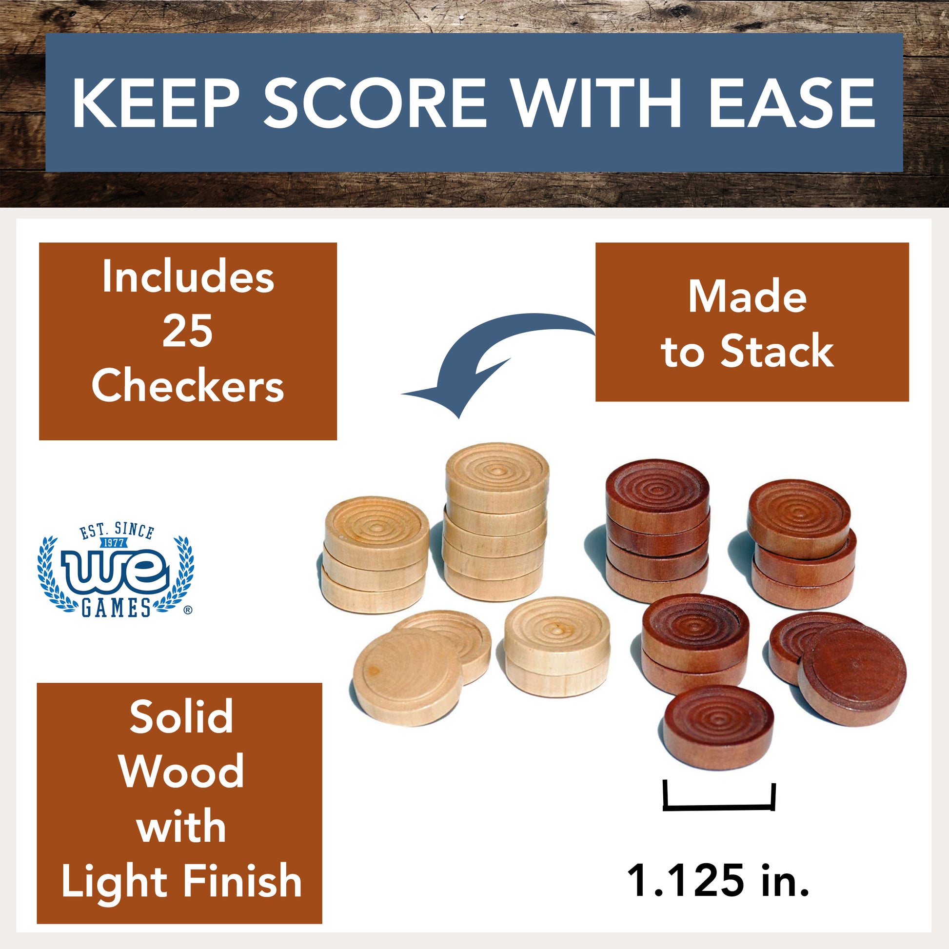 Upgrade your backgammon set with these wood pieces. The pieces feature a stackable ridge for kinging. Due to the nature of wood, the pieces do not lock into place like plastic, but they will nest for stacking purposes. These can also be used to play checkers. Cotton drawstring bag included.
