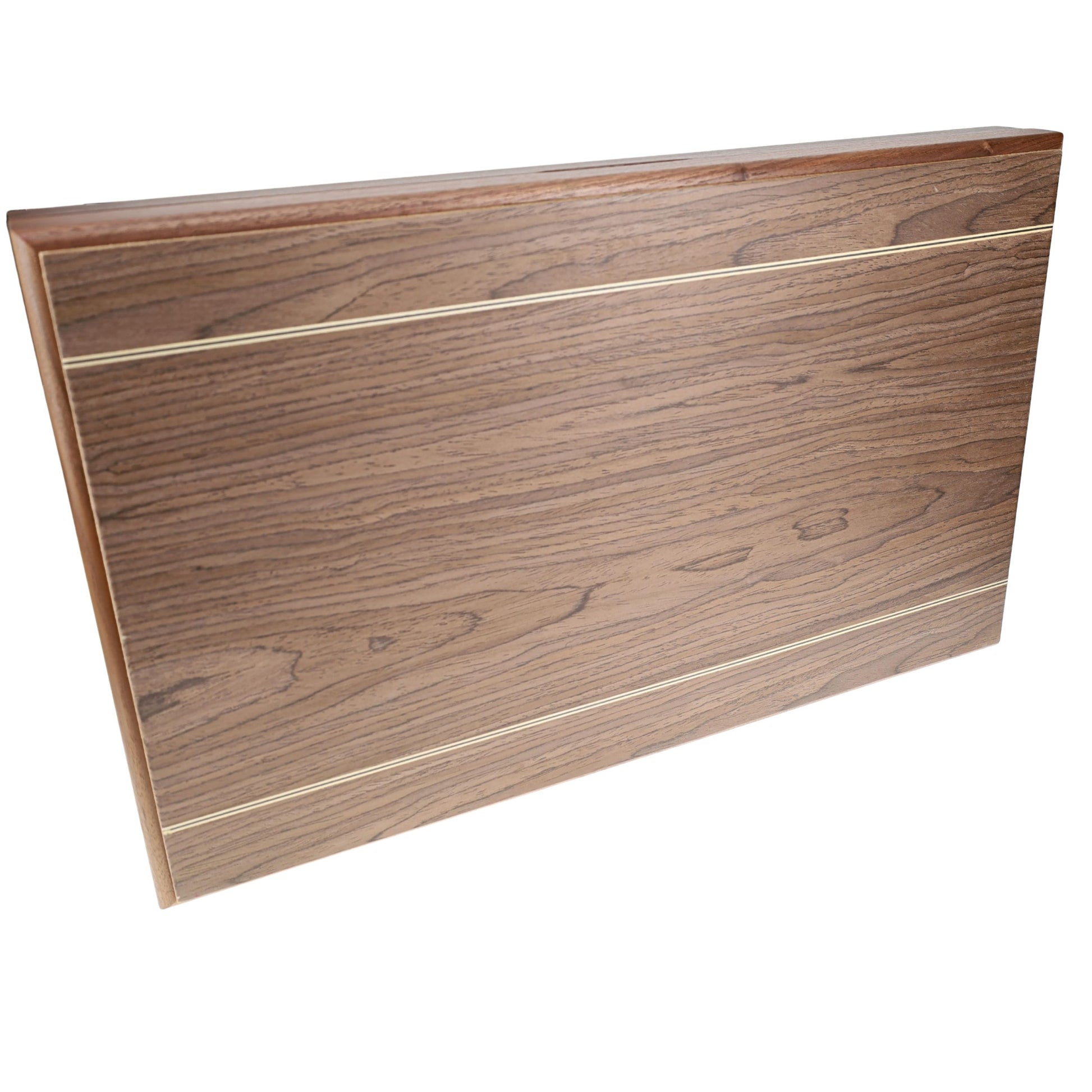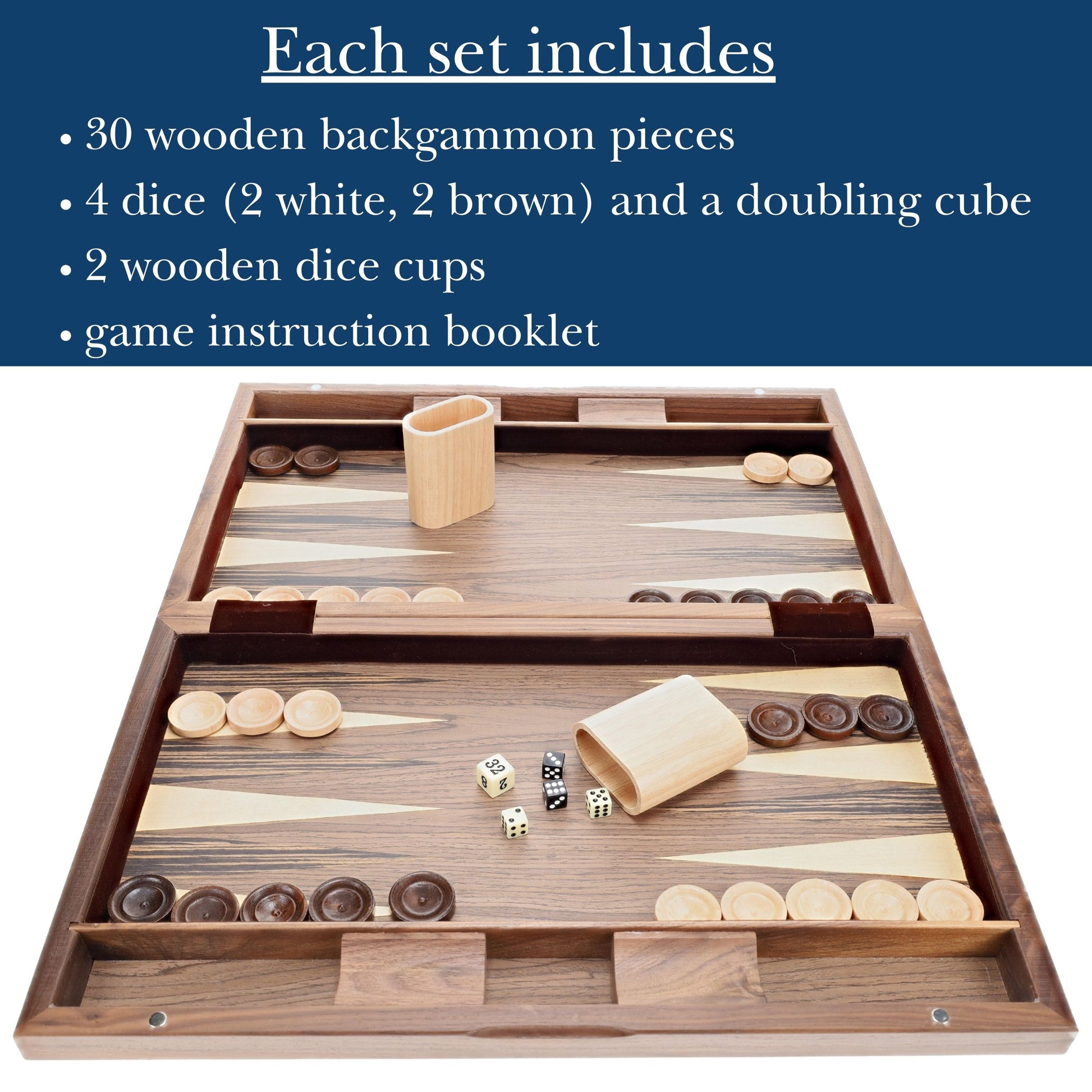 Deluxe backgammon set made from beechwood with a inlaid design and strong magnetic closure. The sturdy and intricate construction of this set is what sets it apart from others, the decorative lines of the case and the board itself are different colored wood inlays. Closed, it measures 19.3 x 12 x 1.25. While open it measures 19.3 x 24 x 2.5 in. The set includes 30 backgammon chips in two different colors, 2 wooden dice cups, 4 dice in two different colors, and 1 doubling cube.